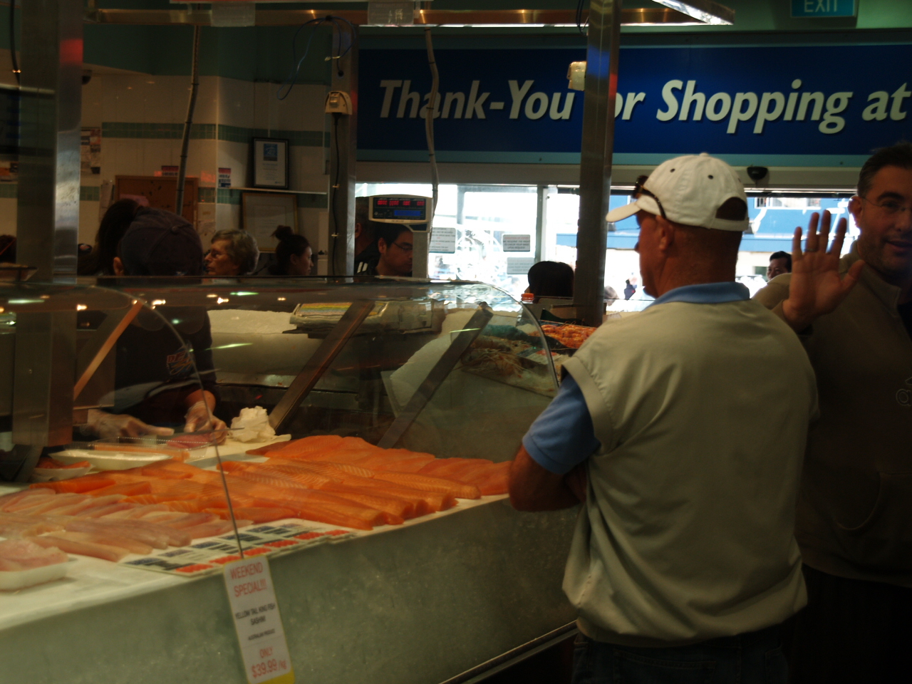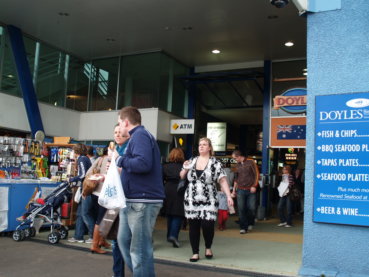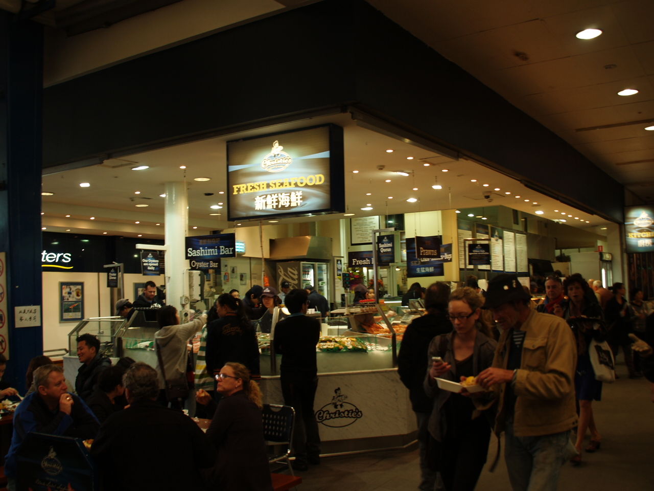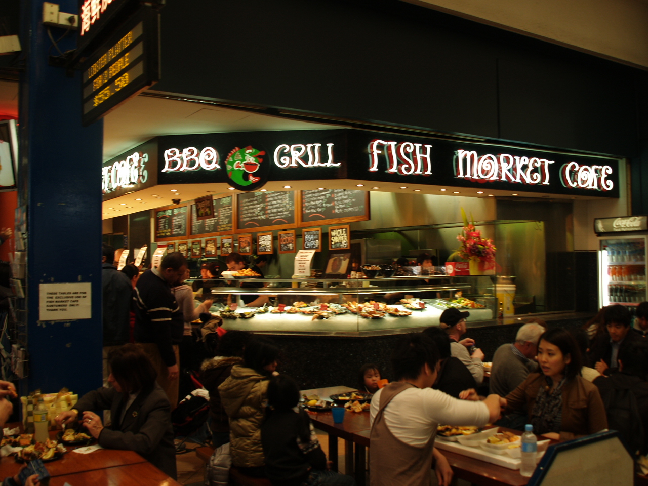 生ガキなど美味が沢山ある。グラス売りのワインもあり食べながら飲むのも良い。カップも買うはめになるので、1つのみで良いかと思う。何かグラス代わりの物を持参すると、安価で済む。中にフードコートの様なテーブルも置かれており、買ったものを思い思いに食べてる。ロブスターなど日本では、非常に高い物も結構安く、楽しめる。