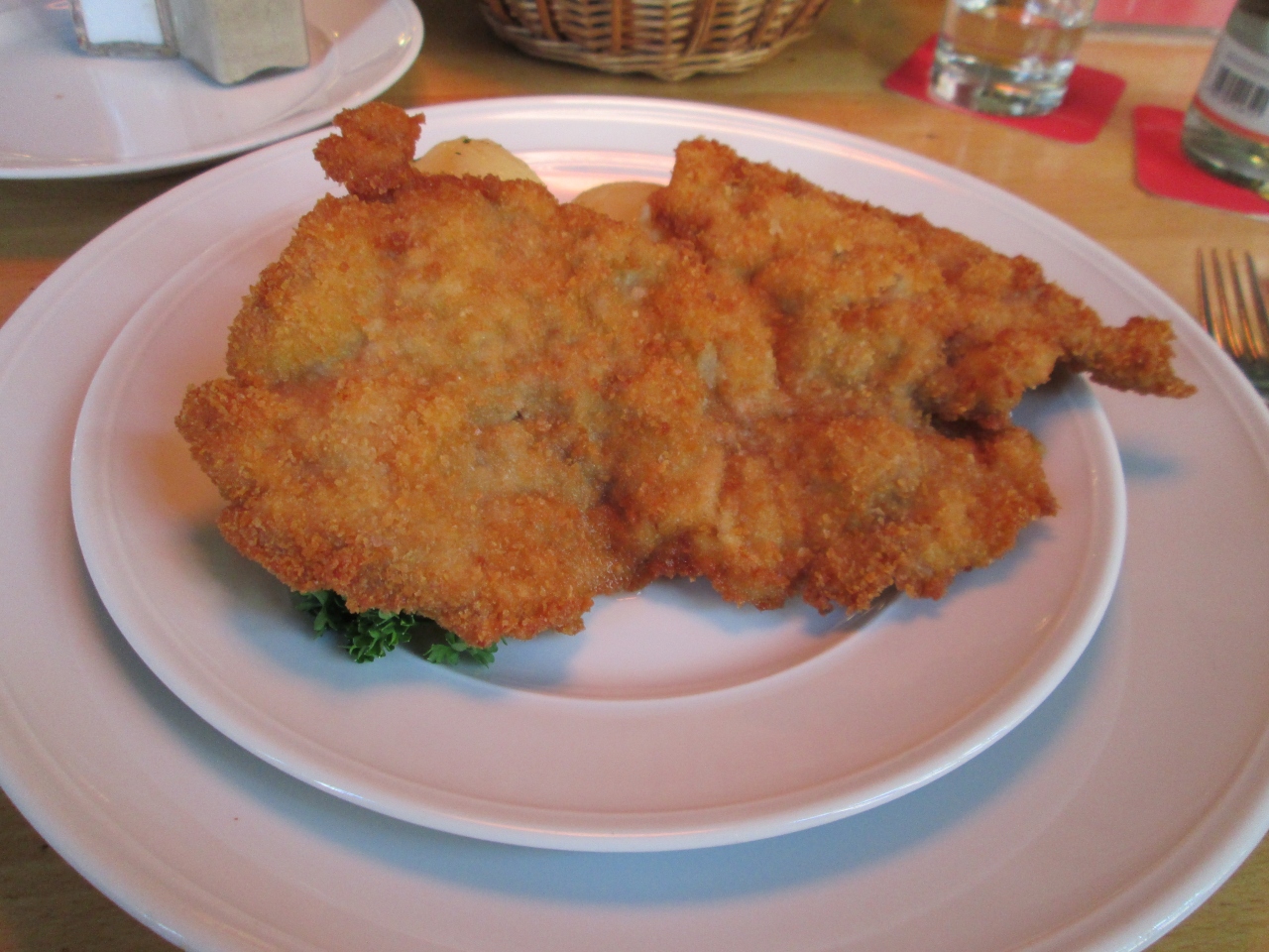 本場のシュニッツェルを食べる目的でこのお店へ。ランチタイムを少しすぎた時間だったため、お店の中は空いていましたが、外の席はまだたくさんのお客さんがいました。シュニッツェルは大きくとてもおいしかったです。パンも数種類ついていて満足できるものでした。担当のスタッフが親切でとてもすごしやすかったです。