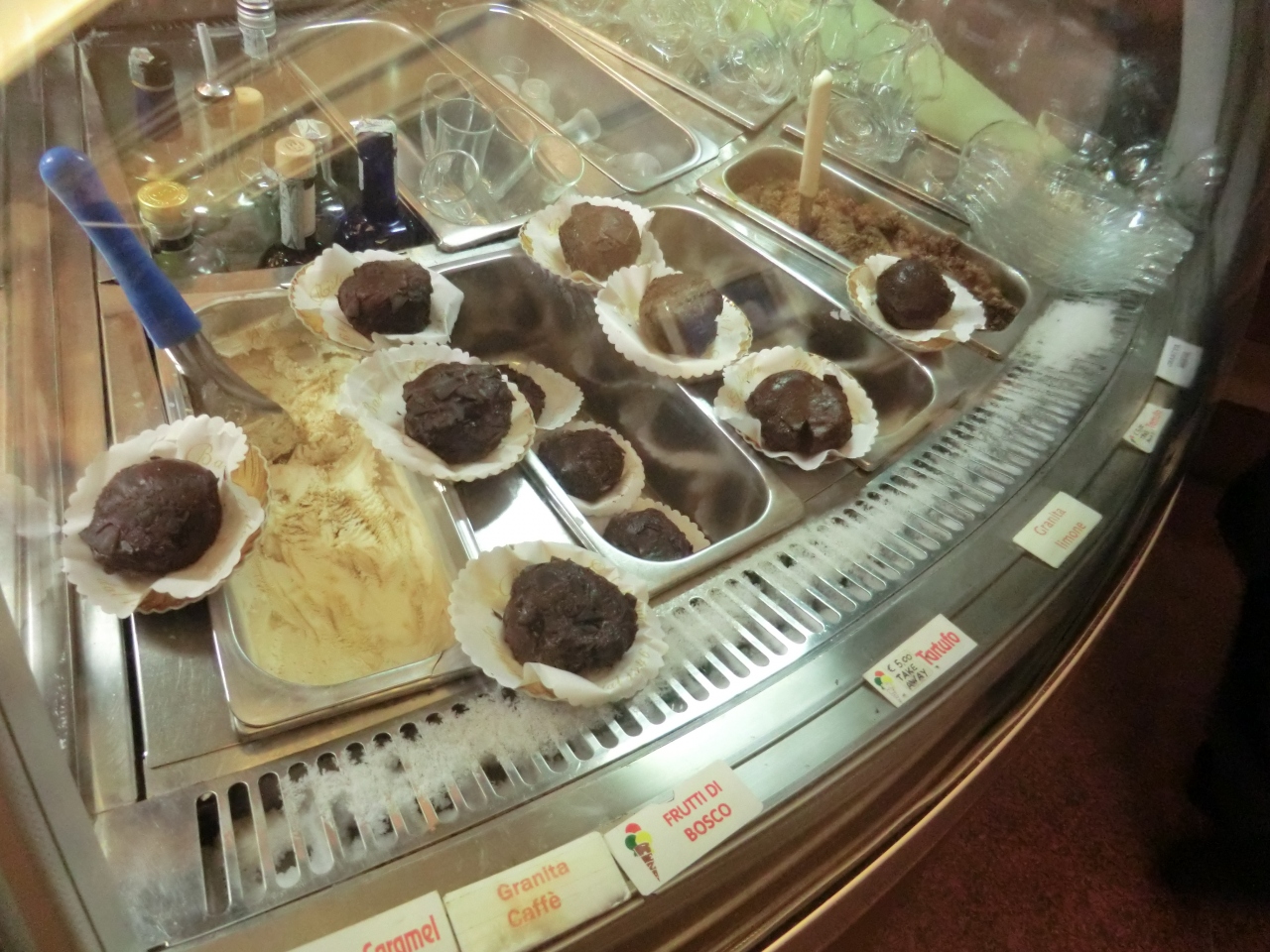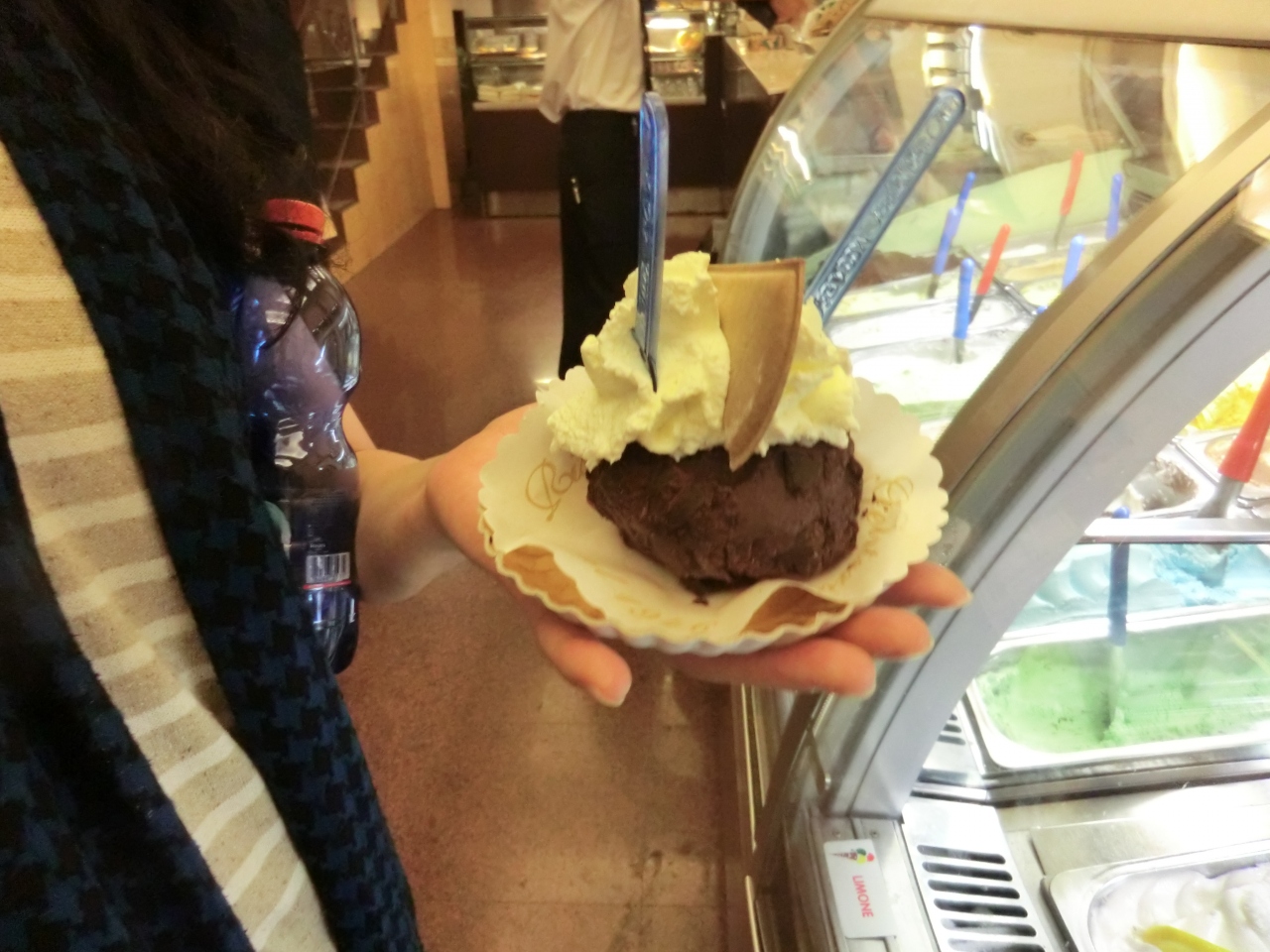 タルトゥーフォ(トリュフ)という名前のチョコレートジェラートが有名ですね。テーブルでも、テイクアウトでもOKです。チョコレートがゴロゴロ入ったジェラートにクリームが、これでもか、というほどかかっていて、甘いもの好きにはたまりません。カップルでシェアでも、十分だと思いますよ。