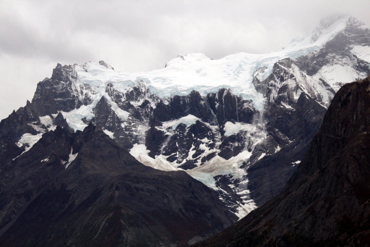パイネ・グランデ(大パイネ)山は名前の通り国立公園の主峰です。3つの峰で構成されていて、ノルデンフェールド湖畔から見ると、左からバリローチェ峰2、600m、その右に中央峰2、730m、さらに右に主峰3、050mです。