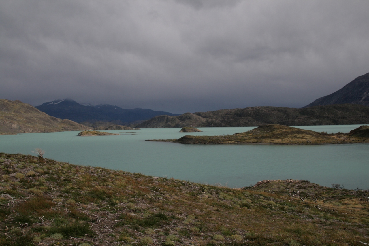 東西に細長く伸びているのがノルデンホールド湖です。その長い湖畔から公園の主要峰パイネ・グランデ、クエルノ・デル・パイネ、パイネ・チコが立ちあがっています。この湖越しには個々の峰は見れますが、全体を一望することは出来ません。少し離れたペオエ湖にその場所を譲っています。また、この湖から流れ出たパイネ川にサルト グランデが懸っています。