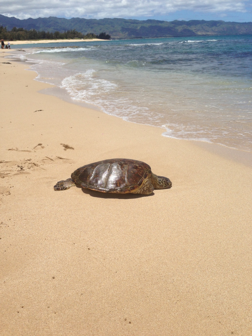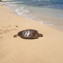 4年前にハワイへ来た時は、間近で海がめを見ることができなかったので、今回は何としても見つけたくて行ってきました。まず訪れたのは「ハレイワアリイビーチパーク」でしたが、水中の海がめは発見できたものの間近では見ることができませんでした。次に「パパイロアビーチ」へ向い、幸運にも日光浴中の小さな海がめと遭遇できました。子供たちにも良い思い出になりました。