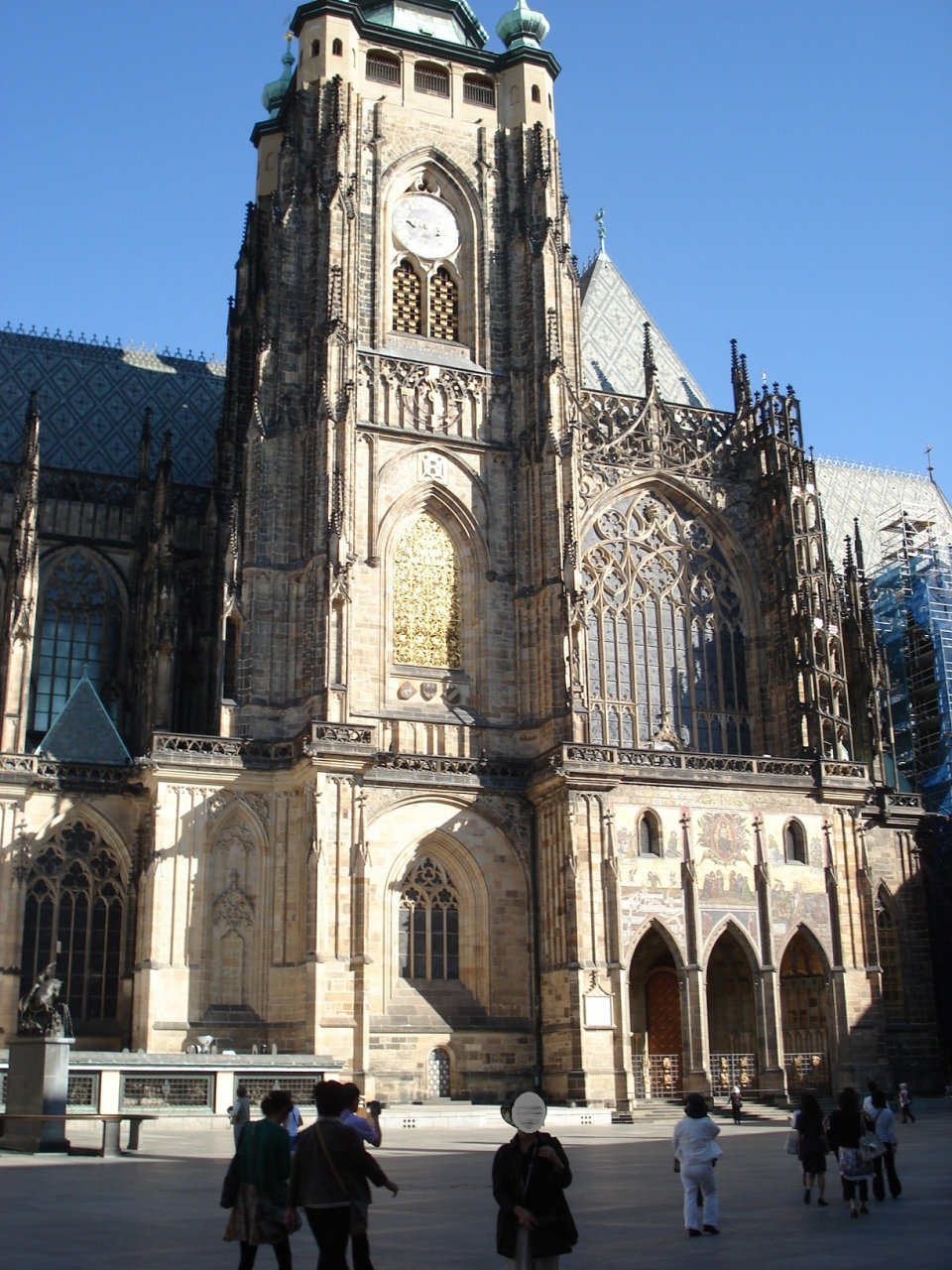 門から場内に入って1番に目にするのがこの大聖堂。シャープな高い尖塔は、ひときわ目立つ。彫刻の美しい薔薇窓はパリのノートルダムを思い出させる。後でカレル橋からこちら側をながめたが、この高く伸びた尖塔が街の美しさを一そう際だてている気がした。