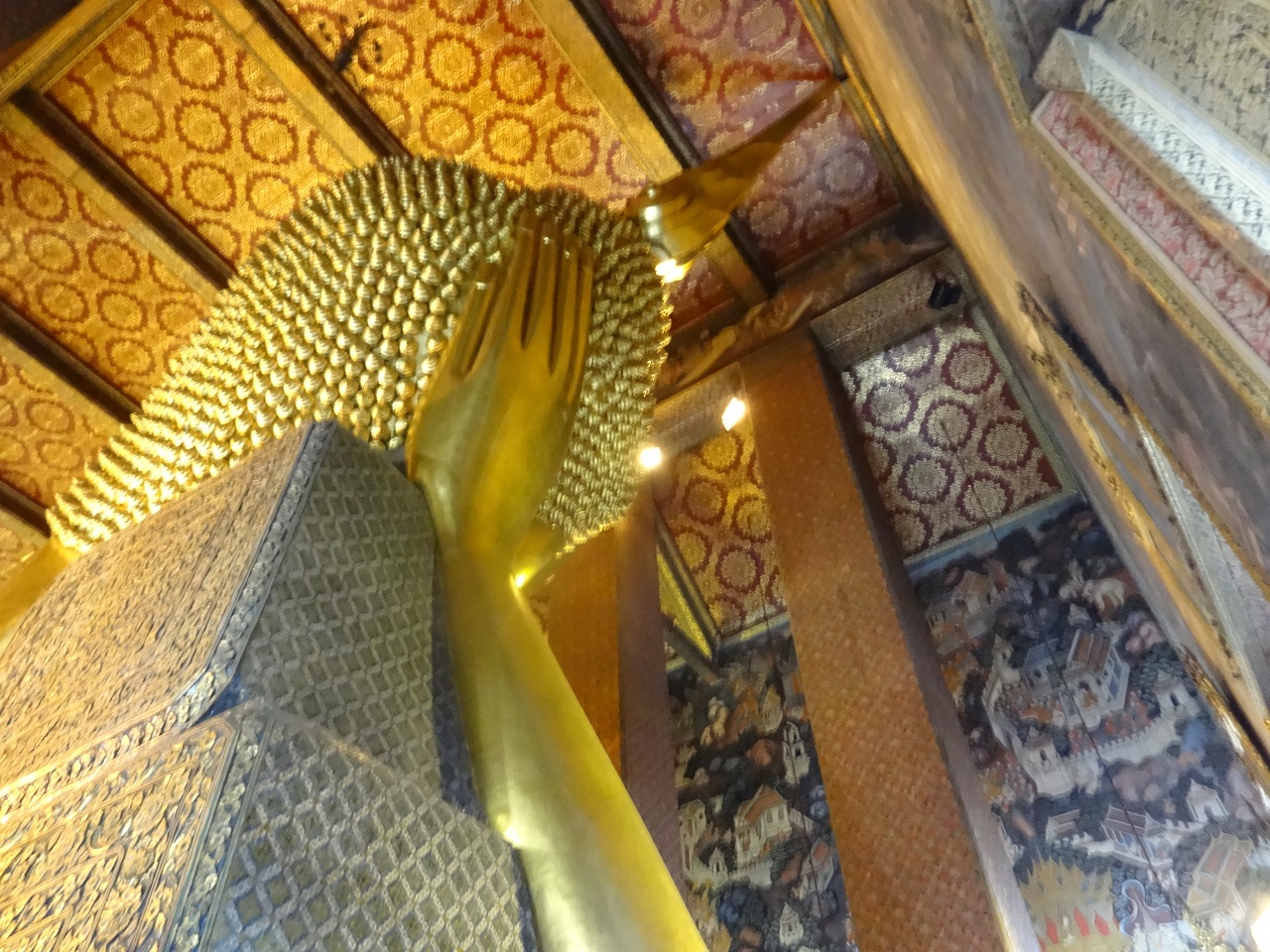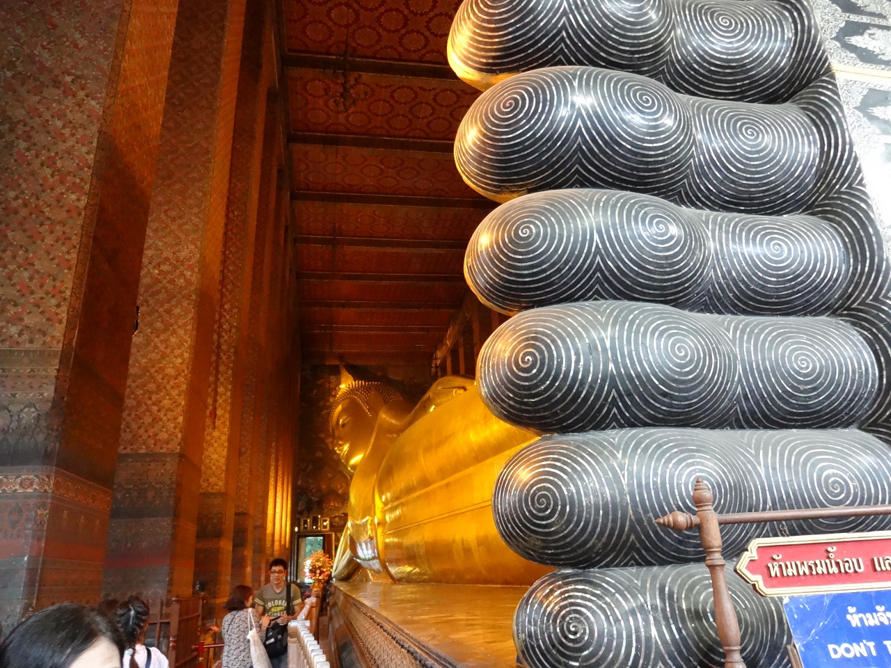 巨大な金ピカの涅槃像。全身を写真におさめるには足の裏を入れないと無理でした。正面の顔から胴体、足とまわって、背面の足から頭の方へぐるりとまわります。天井や壁の模様もきれいでした。ワットポーはタイマッサージ発祥の地ということです。