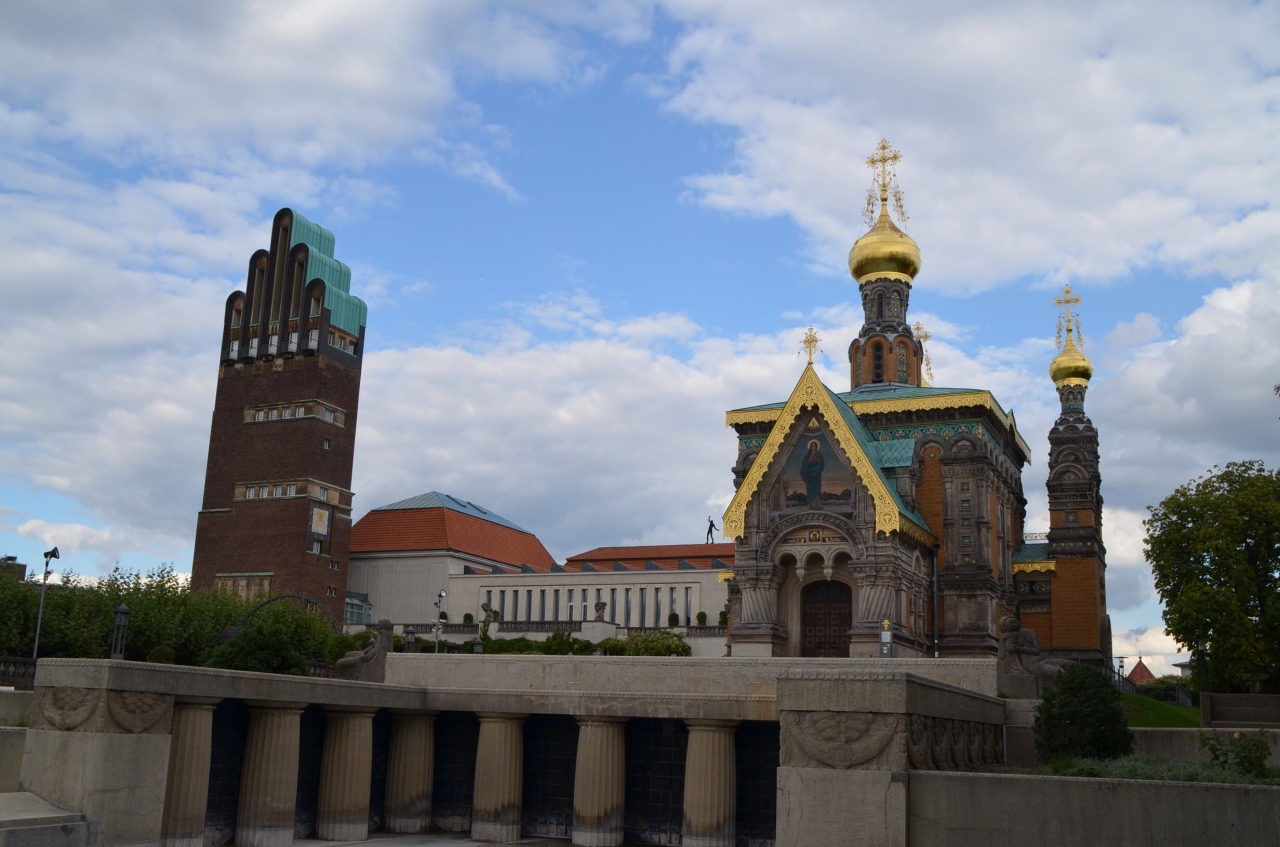大英帝国ヴィクトリア女王の孫にあたるエルンスト・ルードビッヒがエッセン・ダルムシュタット大公となり、1899年にドイツやオーストリアから7名の画家や建築家を招き芸術活動を開始した。オーストリア分離派のヨーゼフ・オルブリッヒ、アンリ・ヴァン・デ・ヴェルデや、新進のピーター・ベーレンスらはそれぞれの自宅を設計して「芸術家村」を作り上げ、「ルードビッヒ館 1901」やルードビッヒ大公とマティルダ妃の成婚を記念する「大公結婚記念塔 1905」などが建てられ、この一帯がユーゲントシュティル美術のメッカとなった。
