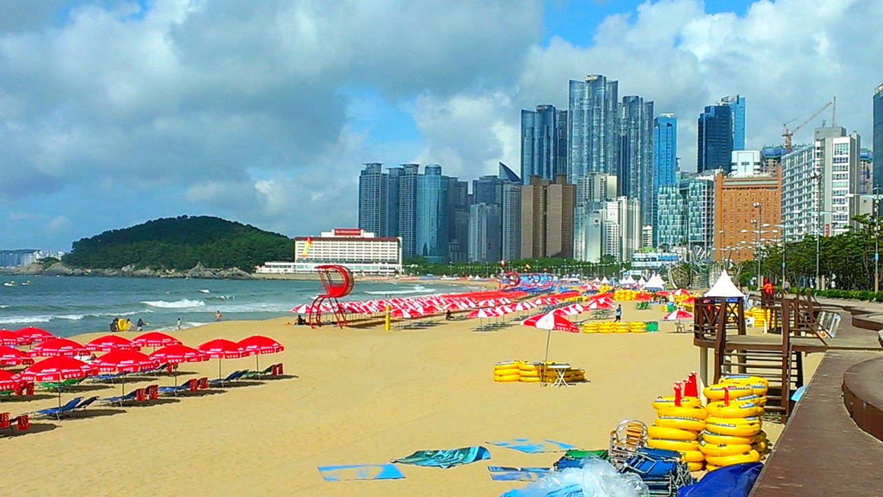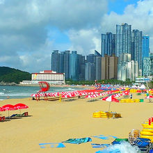釜山の夏はやっぱり海雲台ビーチ。晴れた日に青い海と白い砂浜いっぱいに広がる人工的な色とりどりのパラソルも絵になる。