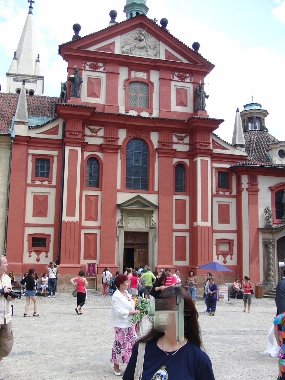 妻とのヨーロッパ旅行、プラハの半日徒歩観光の際に訪れました。本当に美しいの一言。ロマネスク様式の傑作なのだそうです。教会の創始者のお墓が変わっていて、家の形をしています。全体を包む朱というか赤というか・・この色がすばらしく印象的です。とにかく記念写真です。