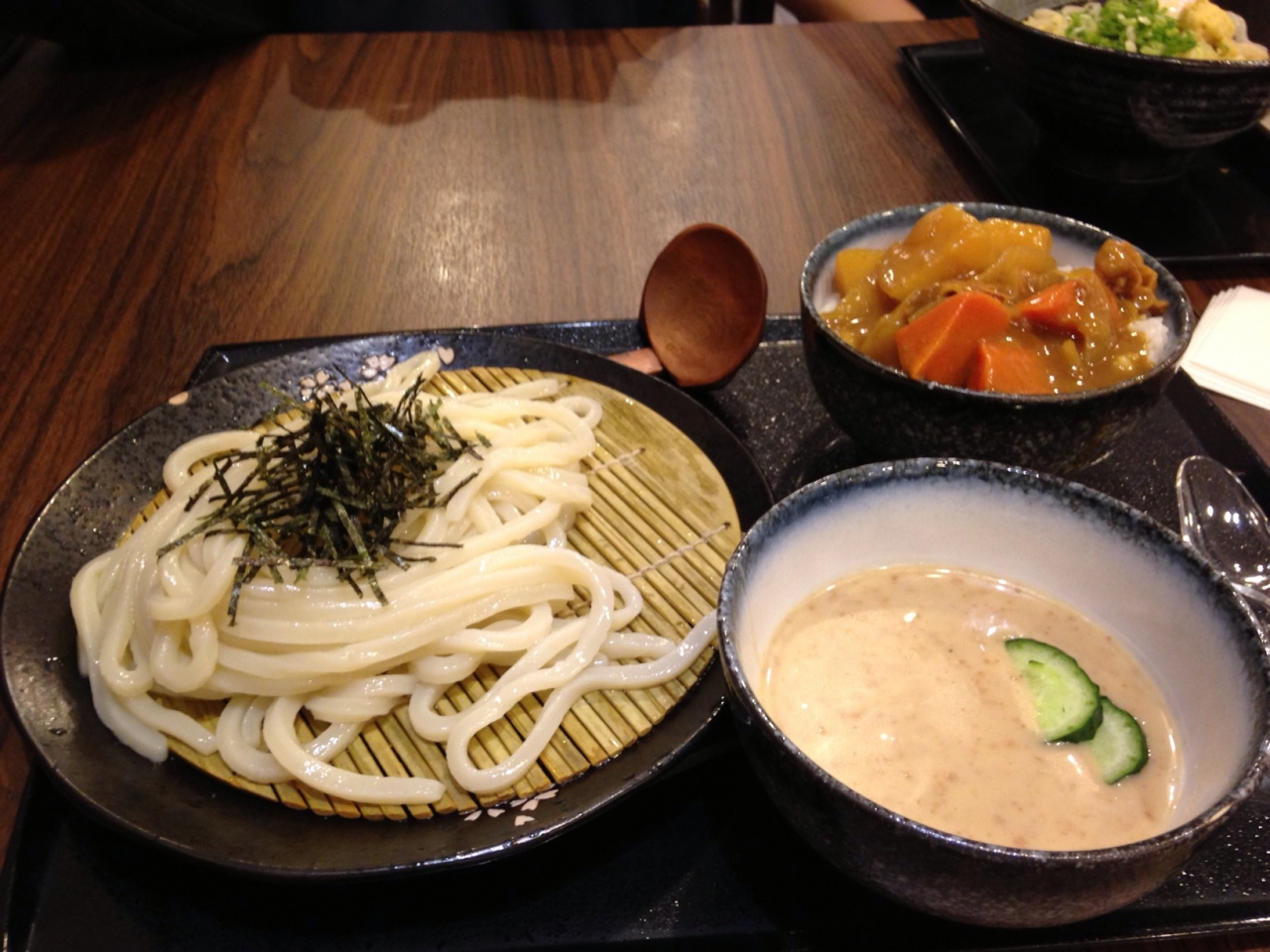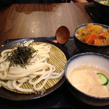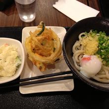 温かい温泉卵乗せうどん、冷たいごまだれつけうどん、ミニカレーライス、かきあげ、ポテトサラダを頼んで食べましたが、意外にもカレーライスが家庭の味でほっこりして美味しかったです。温かいうどんは美味しく頂いたのですが、冷たいつけうどんのゴマダレがサラダのドレッシングのようでイマイチでした。かき揚げはサクサクで食べごたえ抜群。他にも天ぷら、お稲荷さん、小皿のおかずなどがたくさんありました。