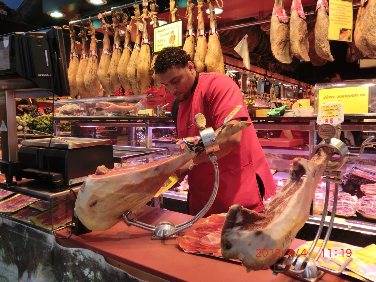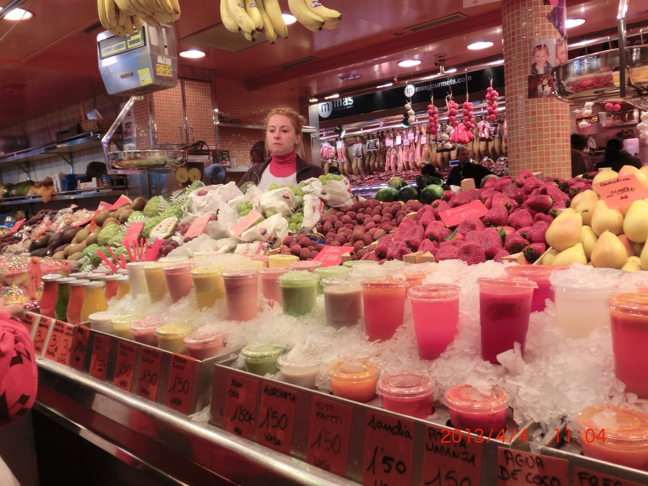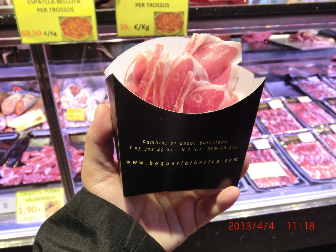 ちょうど歩いてのどが渇いているところに1€くらいでフレッシュジュースが飲めて、イベリコの生ハムもその場でスライスしてくれて食べられます。