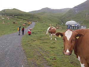 ロープウェイで25分で展望台まで行くことができます。展望台付近では牛が放牧されていて近づいてみることができます。Bachaipsee (バッハアルプゼー)2265mまで約1時間のハイキングをしました。思ったより起伏があり少し息が上がりました。途中かわいい花やワタスゲの花が疲れを忘れさせてくれました。