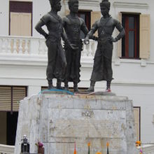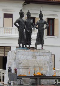 チェンマイ市文化芸術センターの前に黒い「三人の王様の銅像」が立っている。スコータイ王国のラームカムヘーン王、パヤオ王国のガムムアン王、そしてラーンナー王国のメーンライ王で、同盟を誓い合った逸話を元にして建てられたそうだ。ランドマークとしてもわかりやすい。