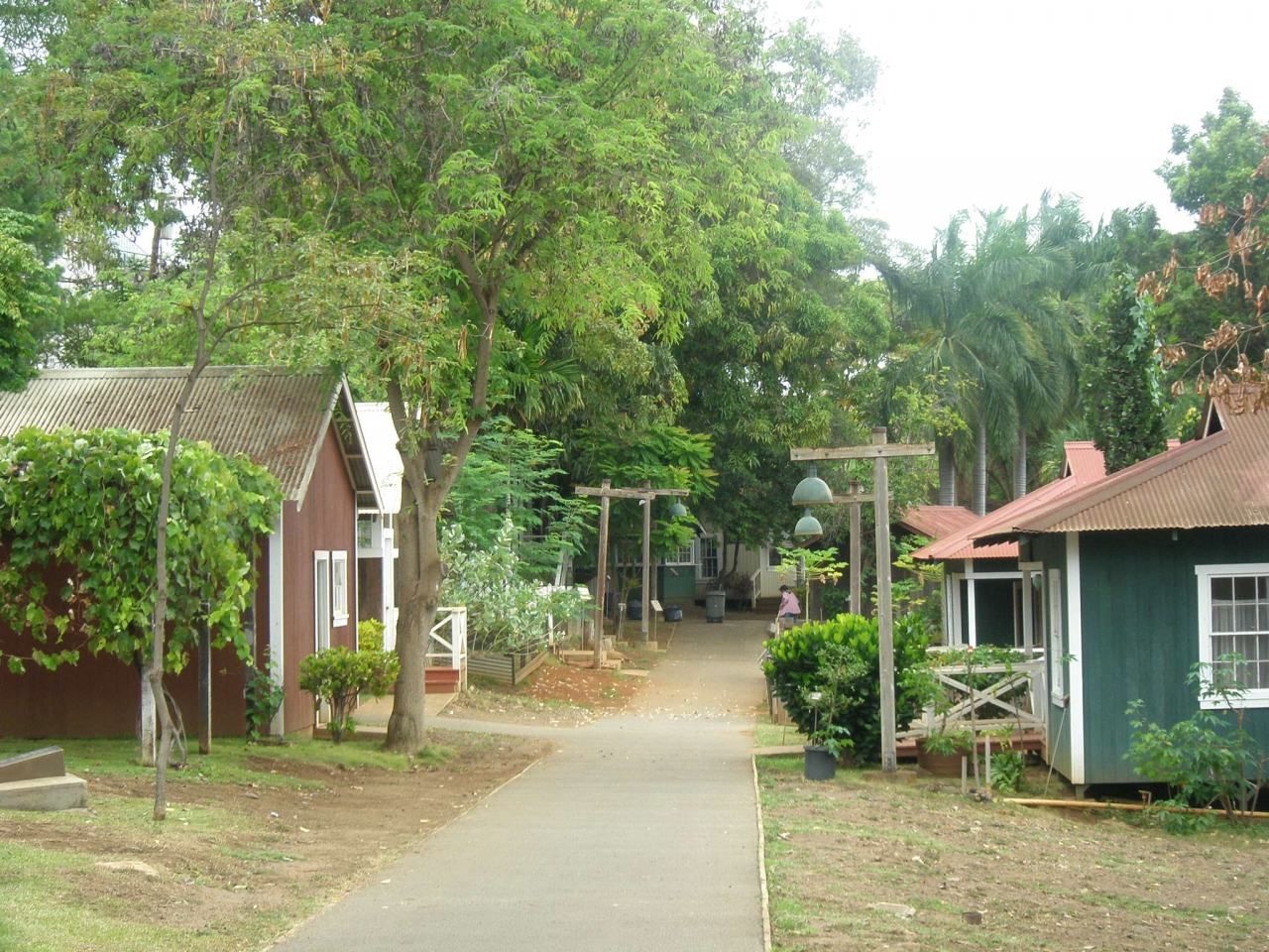 屋内展示には移民の歴史やサトウキビプランテーションでの作業着等が、屋外展示には日本、沖縄、韓国、中国、プエルトリコ、ポルトガルなどからの移民の家が並び、銭湯や診療所、売店、食堂、集会所、神社といった共用施設として使われた建物が昔の街のように立ち並んでいました。また、移民が食べていた果物の試食コーナーもあり、パンの実、マウンテンアップル、サトウキビなどを味わうことができました。マカデミアナッツの硬い殻を自分で石で割って食べるアトラクションもあり、興味深かったです。