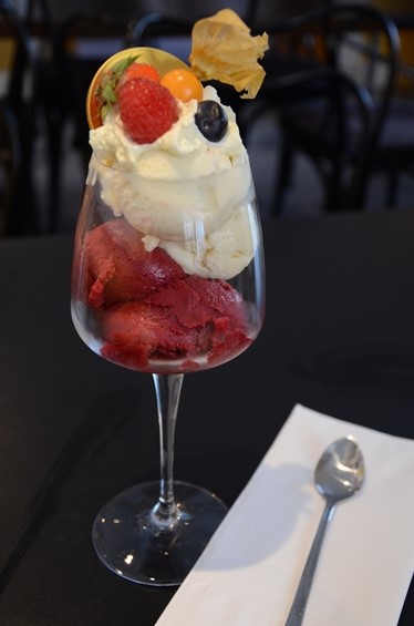 カシス味のソルベの上にバニラ味のアイスクリームが乗っかってきます。