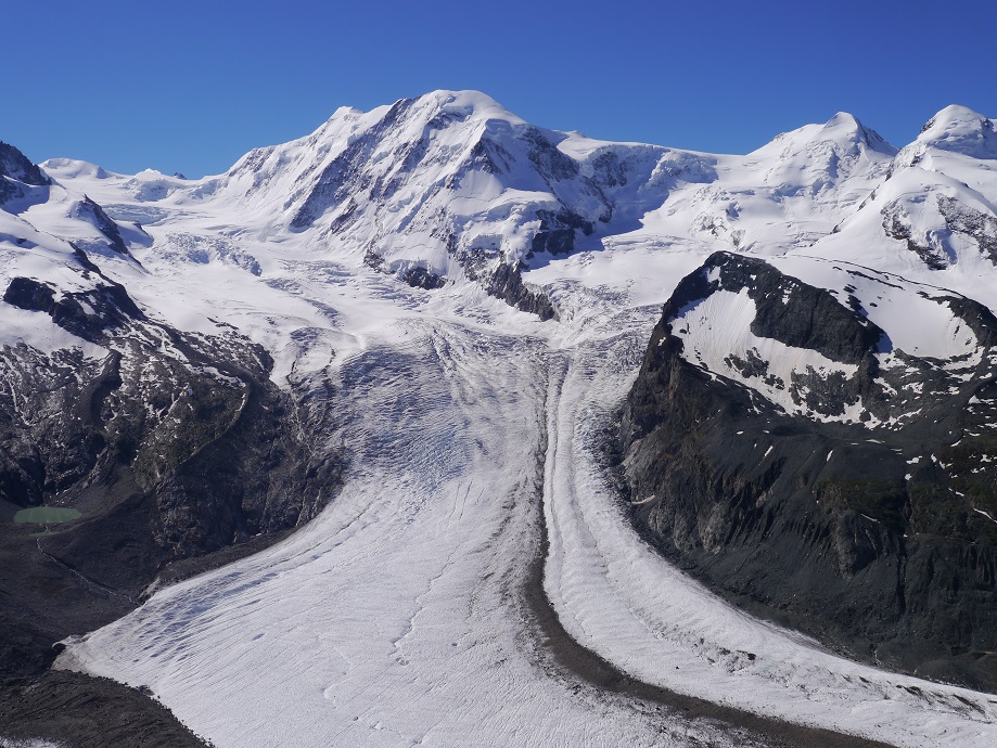 ゴルナーグラート鉄道にて終点のゴルナーグラート駅まで。駅を出ると目の前にホテルが現れます。その裏からちょっと歩くと展望台となります。マッターホルンはもとより目の前の氷河の流れのきれいなことといったら、なんと表現してよいか。見とれてしまい、時の経つのも忘れてしまうことでしょう。
