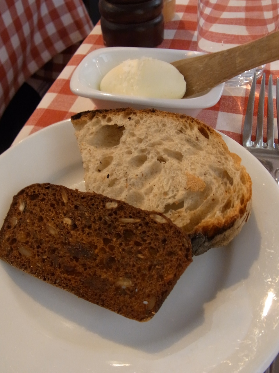 赤いギンガムチェックのクロスに、ちょっとモダンでおしゃれな内装、お料理もワインもパンも、センスが良くおいしく感じました。パリとはひと味違ったビストロの雰囲気です。