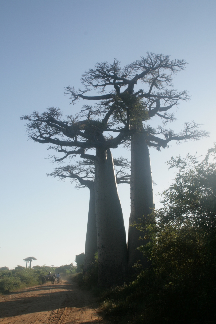 国道8号線に曲がって進むと、近くに、そして、遠くにバオバブが見えます。その足下には青々とした水田とホテイアオイに埋まった沼地が拡がっています。この辺りの稲作は2毛作だと云うことです。国道8号線を15分ほど走ったところで、道路際に一際大きく感じるバオバブがあります。根元近くで2つに分かれた、「双子のバオバブ」です。高さに優に20mを越えていますから迫力があります。なお、ここからさらに5分くらい走ると有名な「バオバブの並木道」です。