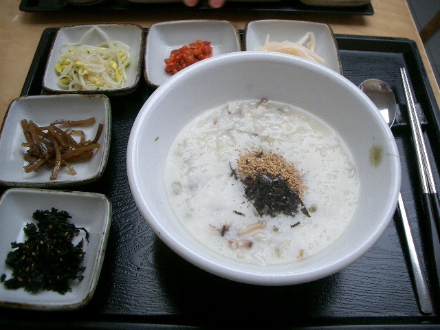 明洞の粥専門店です。神仙ソルロンタンの2階にあります。朝9時過ぎに行ったら階段で5,6人が並んでいました。待ち時間は約7,8分でした。店内は明るく清潔感があります。メニューには日本語が書いてあるし、店員さんも日本語が通じます。私が注文したのはアワビ粥。値段は10000ウォンでした。娘は人参のお粥を頼んだのですが、店員さんに「人参だけだと物足りないよ」と言われて、人参と鶏肉のお粥にしました。値段は8000ウォンでした。