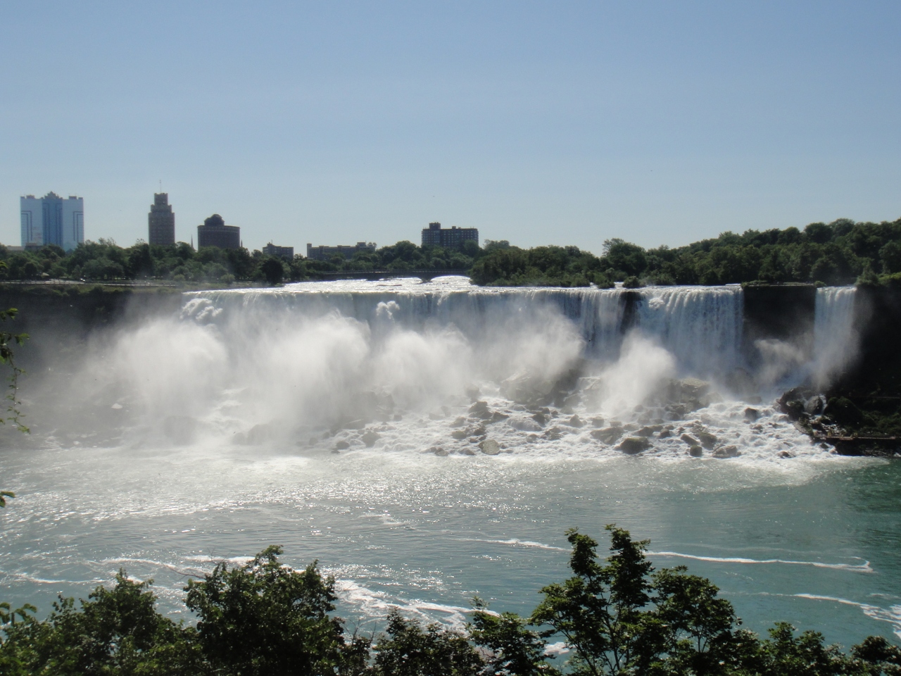 ナイアガラの滝の2つの滝の1つ、アメリカ滝。有名なカナダ滝に目がいってしまいますが、アメリカ滝も迫力があります。アメリカ滝を正面から見るのはカナダ側のナイアガラフォールズで、左側がアメリカ滝、右がカナダ滝になります。両方の滝を1枚の写真におさめることのできる場所はなかなかありません。