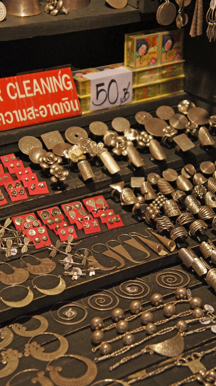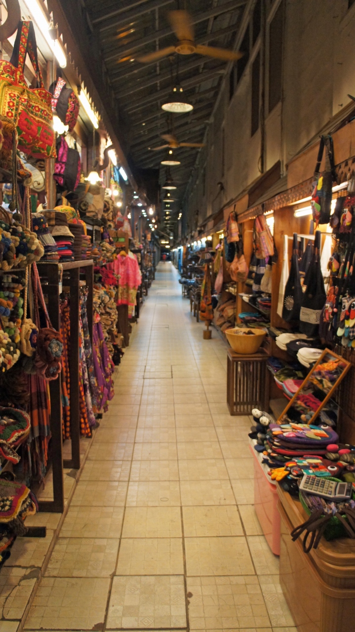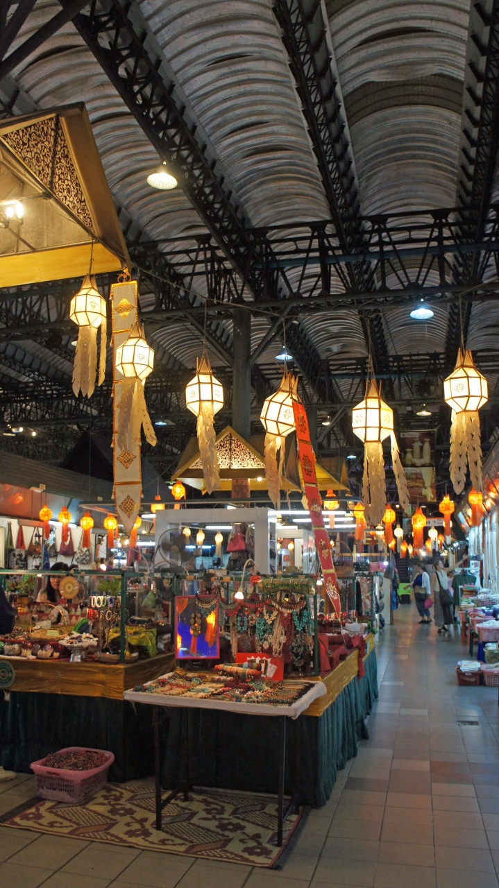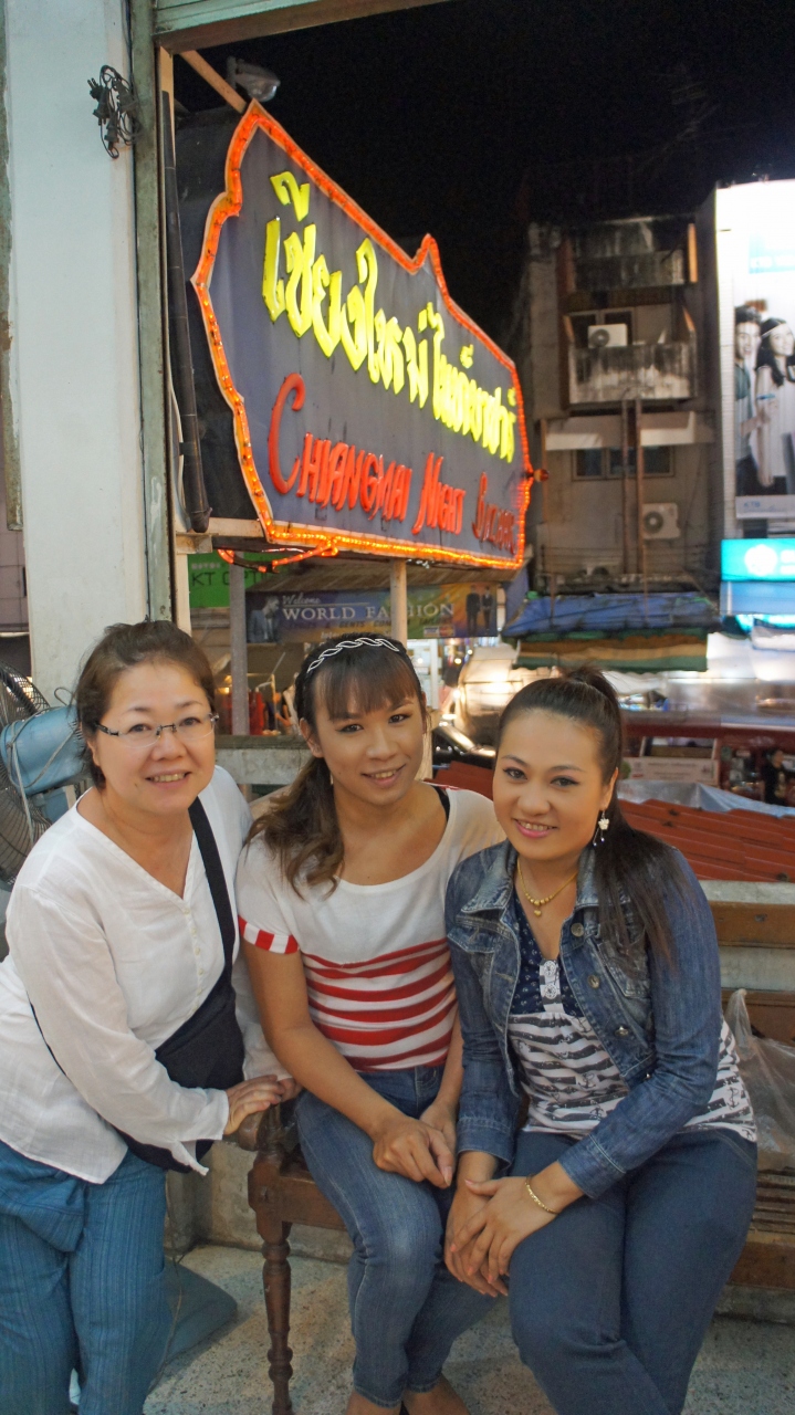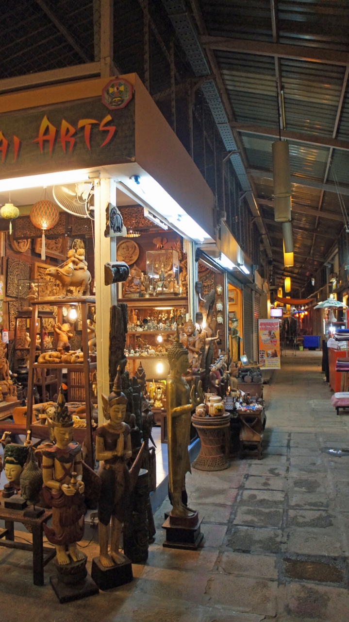 チェンマイに来たら一度は歩いてみるのも良いと思います。買い物をすることを考えるとサタデーマーケットやサンデーマーケットの方が楽にできると思います。売っている物はどこも大差はありません。値段も大きく違うことはありません。歩行者天国になっている訳ではないので歩道の狭いスペースに夕方になると屋台が運ばれてきて営業が始まります。歩道は更に狭くなるので人が行き交うのも大変ですが賑やかさは満喫できます。通りの中ほどにナイトバザールビルがあり、大きめの店も並んでいます。ただ、ショッピングセンターの半分の店は閉鎖され、通り側の半分くらいしか営業していません。ほとんどが定価販売で数を買うと多少安くなる程度でした。(もともと安いですから。)面白かったのは変身写真を撮ってくれるスタジオでした。チェンマイでは10日ほど時間があったので暇潰しの意味もあって入ってみました。女性はメイクとヘアメイクと衣装、男性は衣装を借りて15カット位(各2回)撮ってパソコンで10カット選んで半切り1枚と6つ切り1枚と2L8枚の紙焼きとCD1枚をもらって1000Btでした。時間は45分から1時間で済みます。写真屋さんは5~6件ありますが値段はどこも同じようです。