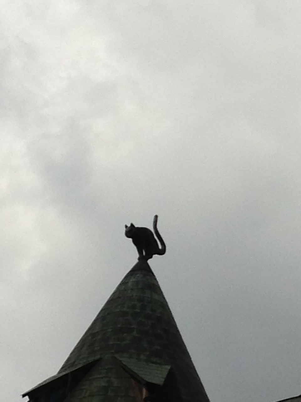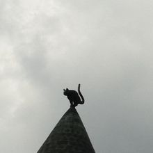 建物の下は黒猫が描かれたカフェになっています。ここに着く少し前から上を見ている方がよく見えます。クロネコがてっぺんにいるだけなので一瞬で観光は終わります。わざわざ行かなくても市街観光中に通りそうです。
