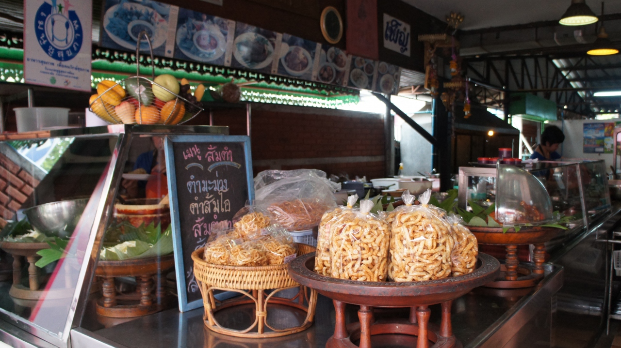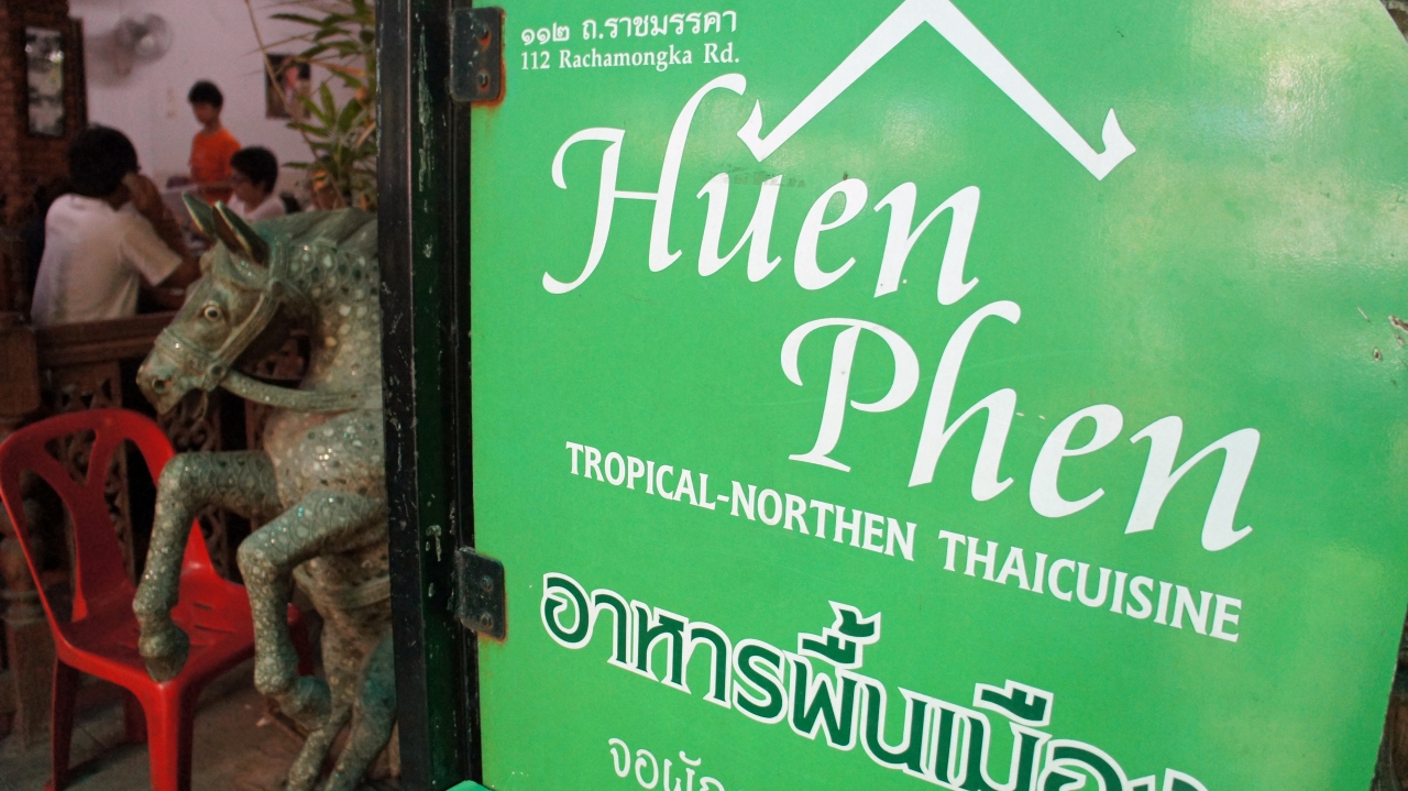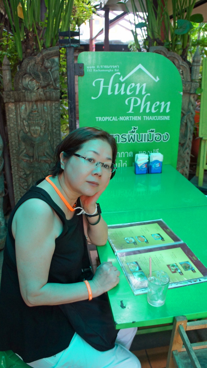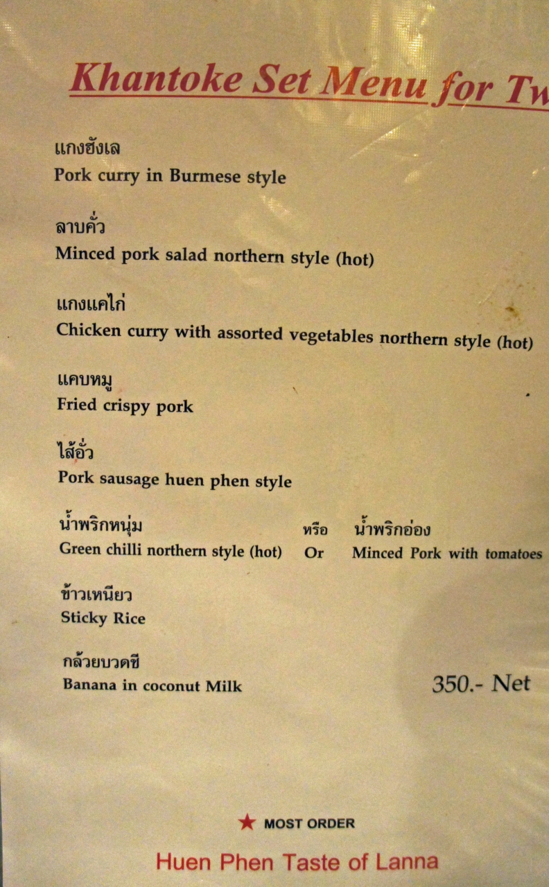 お寺巡りの途中で通り掛かったので遅い時間のお昼になりました。1時過ぎだというのに次から次にお客さんが入ってきます。そのほとんどが中国系の方々。(チェンマイではどこでもそうですが)あまりお腹が減っていなかったのでパパイヤ・サラダとカオ・ソーイを2種類注文しました。この店のカオ・ソーンは美味しかったです。ちょうど夜のレストランの入口前の席だったのでぜひ夜にも来たいと思いました。帰国前に近くを通る機会があったので飛び込みで入ってみました。予約が必要と書いてある本もあったので心配して行ったのですが、5時10分ではほとんどガラガラでした。が、6時には満席!我々以外は全て中国系の方々でした。(隣の席の方は簡単な日本語を話され、こちらも片言中国語で友好に尽しましたが。)こちらは早々に注文を終えていましたが、他のお客さんはメニューの内容を聞いて時間がかかり、スタッフもイライラしてあまり良い状態ではありませんでした。早い時間に行って店のインテリアの写真を早々に撮って(アンティークショップより美しいです。)さっさと食べて店を出るのが得策と思えました。