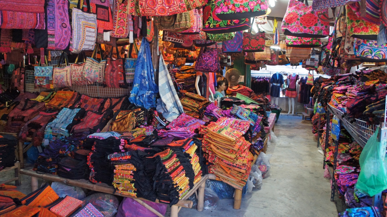 市場に隣接していますが、曜日によってお休みがあるので注意が必要です。店と言うよりは掘っ立て小屋のような集合体にこれでもかと言うように商品が並んでいます。一体モン族の人が何人で作っているのかと想像するとものすごいパワーを感じます。果たしてあらゆる種類のものが全部ここに揃っているのではないでしょうか?50Btが売値の小物入れなどは元々が安いので10個買ったらなんて値引き交渉には乗ってもらえませんでした。これ1個売って150円かと思うと値引くのが気の毒になる値段でもあります。日本に持って帰って使うことを考えると今までに数多く失敗もしているのでなかなか手が出ないこともありました。染色製品や刺繍製品ばかりで銀製品なんかも置いてあればと思いました。