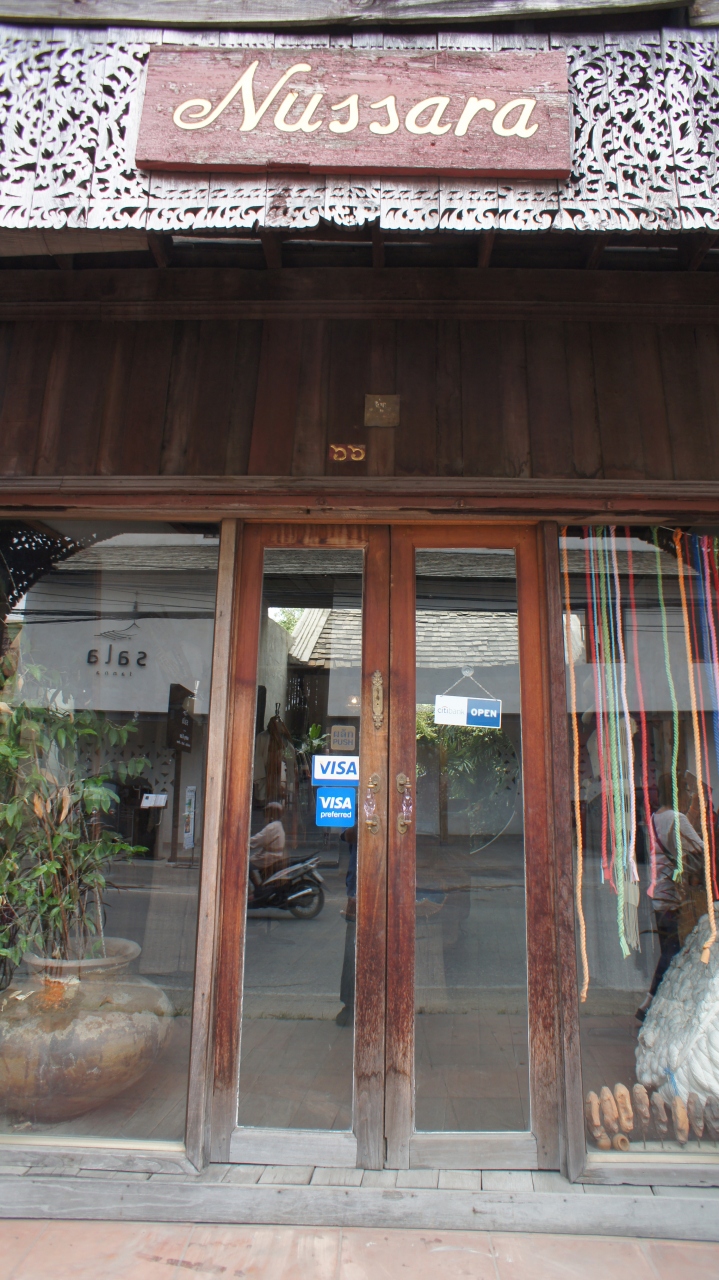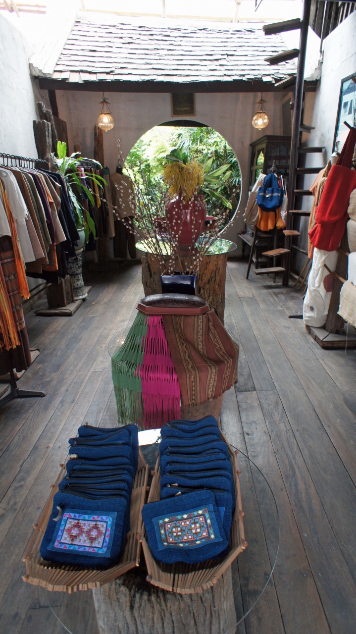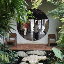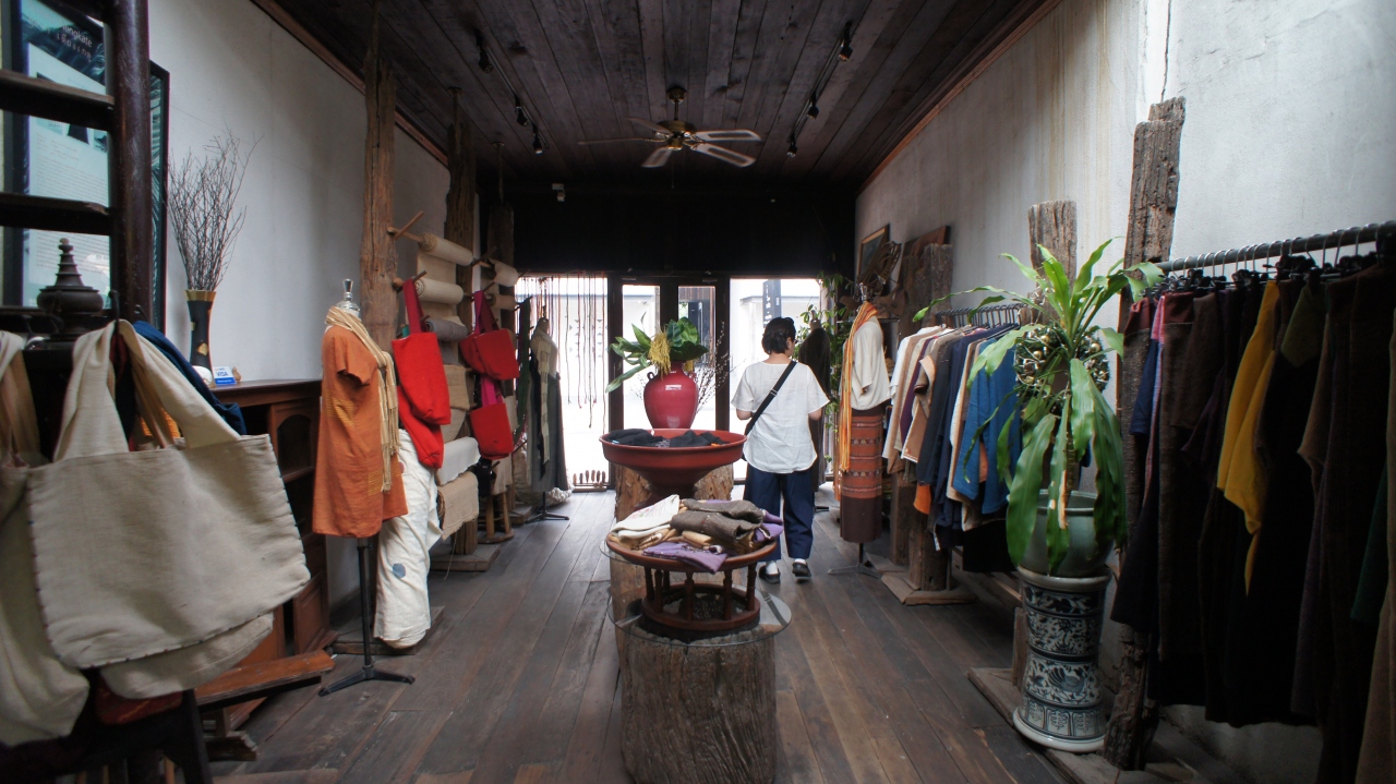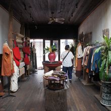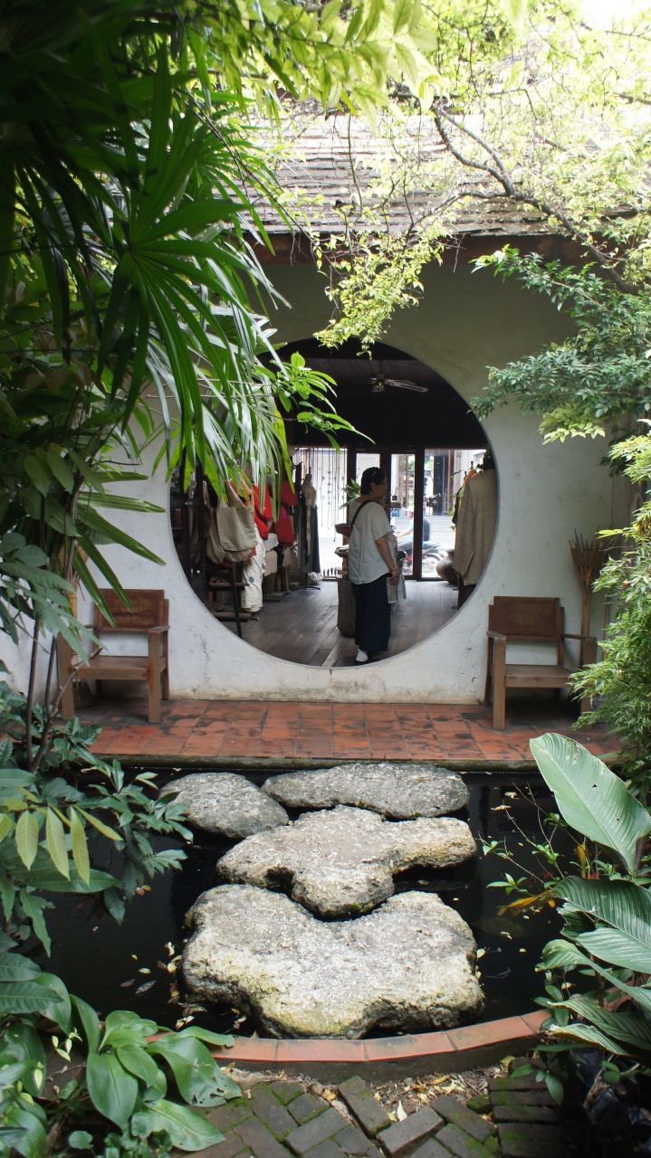 チャルンラート通りの古い建物に入っています。細い間口の部屋を抜けるには中国の江南のお屋敷にあるような円形の開口部を潜り抜けます。すると飛び石のある小さな池があります。一見浅いと思ったのですがこれが深く、大きな魚が泳いでいます。これだけでも一見の価値があると思います。妻が買い物をしている間インテリアばかり見ていました。往時を偲ばせる物がたくさん残っているチャルンラート通りです。
