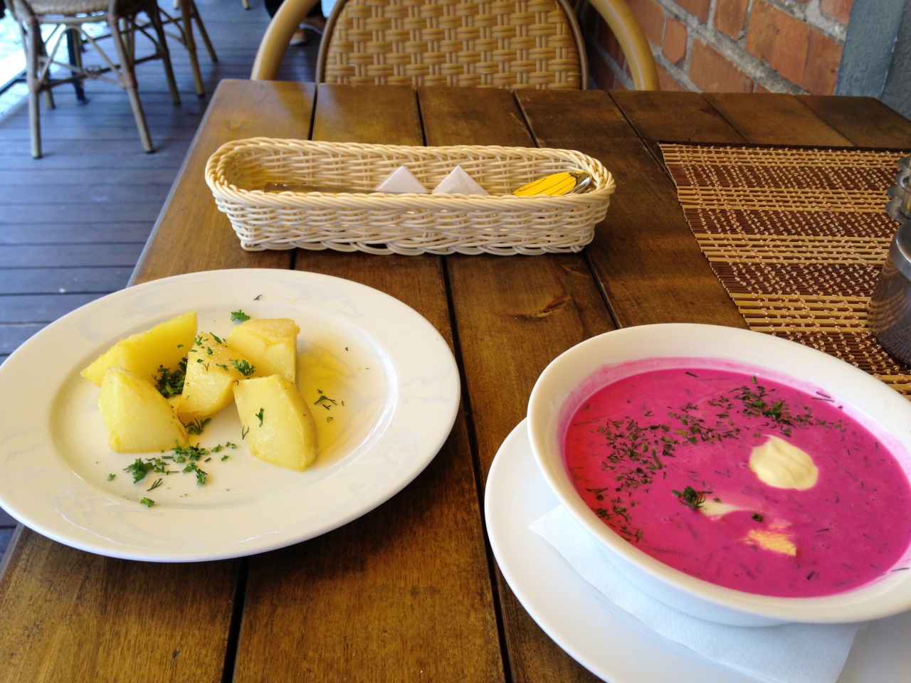 ビーツのスープをいただきました。他の店もですが一緒にポテトもついてくるのでお腹がいっぱいになります。可愛いピンクの色をしていてもビーツ=味は野菜のスープでした。冷たいスープで日本では味わえないのでいい経験だと思います。写真付きメニューはありませんでした。