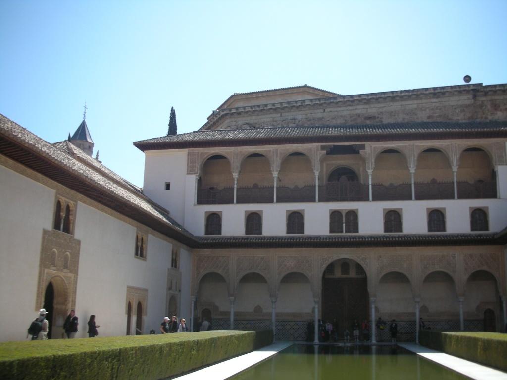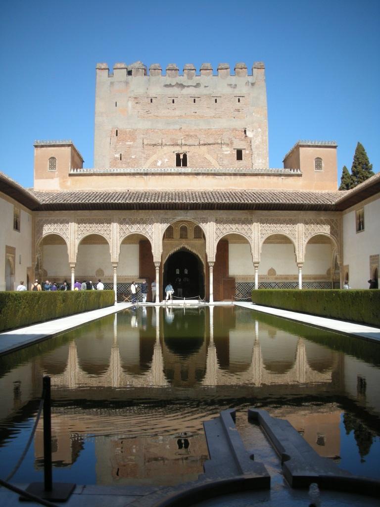 アルハンブラ宮殿のナスル宮といえば、このアラヤネス(天人花)の中庭ですかね。コマレスの塔(大使の間)を見る角度です。2つ目の画像はその反対側のパビリオンです。白い壁に緑の生け垣、水面に映る塔、そのバランスが美しいです。
