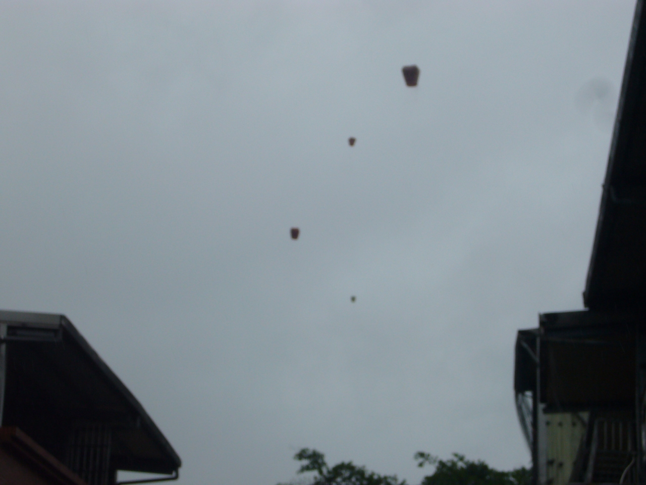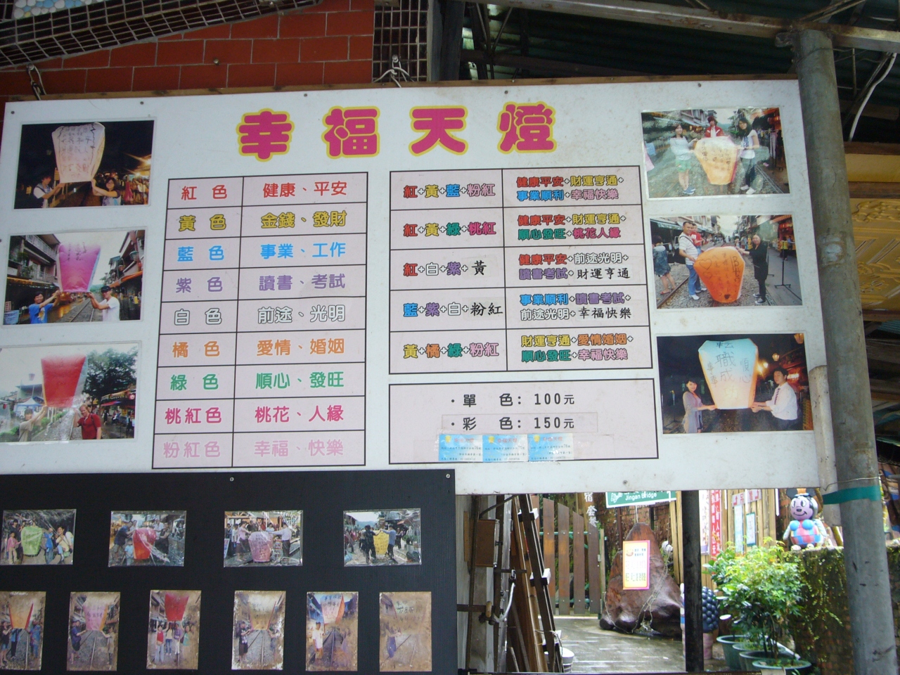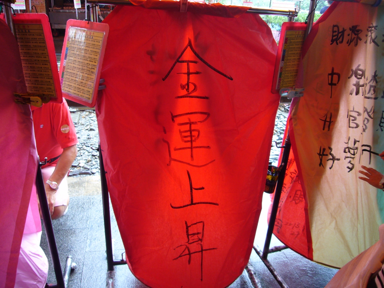 台北と比べると、とてもゆったりと時が流れています。「十分駅」の平渓線の線路の脇で「天燈上げ」をやっています。線路の脇なので、列車が来るとすぐに内側に避難。「天燈上げ」は、まず、自分の願いに応じて天燈の色を決めます。色が決まったら、天燈の4つの面にお願いごとを備え付けの墨と筆で書きます。書いたら係りの人が、お願いごとを書いたそれぞれの面を写真で撮影してくれます。その後、天燈を空に向かって上げます。天燈は空高く舞い上がります。天まで届け!