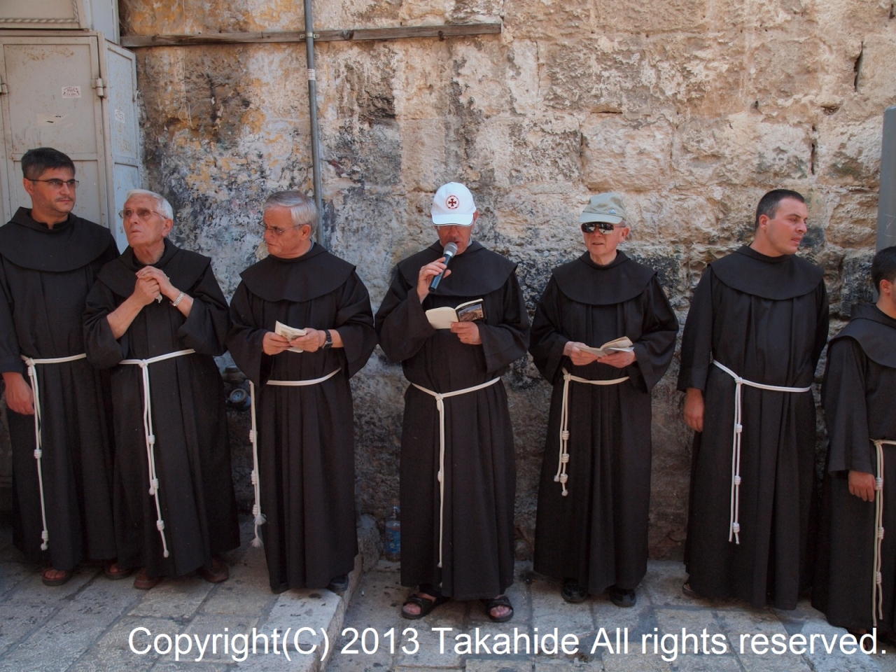 イエスが死刑の判決を受けた要塞跡の学校から墓の在る聖墳墓教会までの14留をフランシスコ派修道会の修道士に先導されながら歩くことが出来ます。