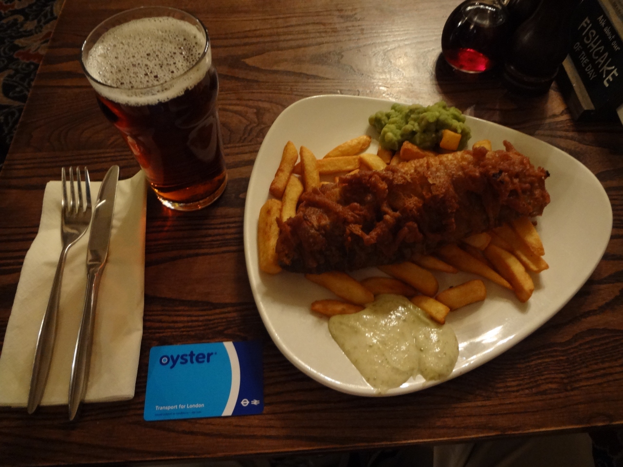 夕食で行きました。2階席に行くと料理が出るまで50分かかるよ、と言われましたが、1階が満席だったので、ゆっくり待つことにしました。シャーロックホームズ・エールとフィッシュ&チップスを頼みました。フィッシュ&チップスはとても大きく、カラッと揚がっていて美味しかったです。人気の店とあって帰る頃(夜8時頃だったかな?)には並んで待っている人がいました。早めに行くことをお勧めいたします。