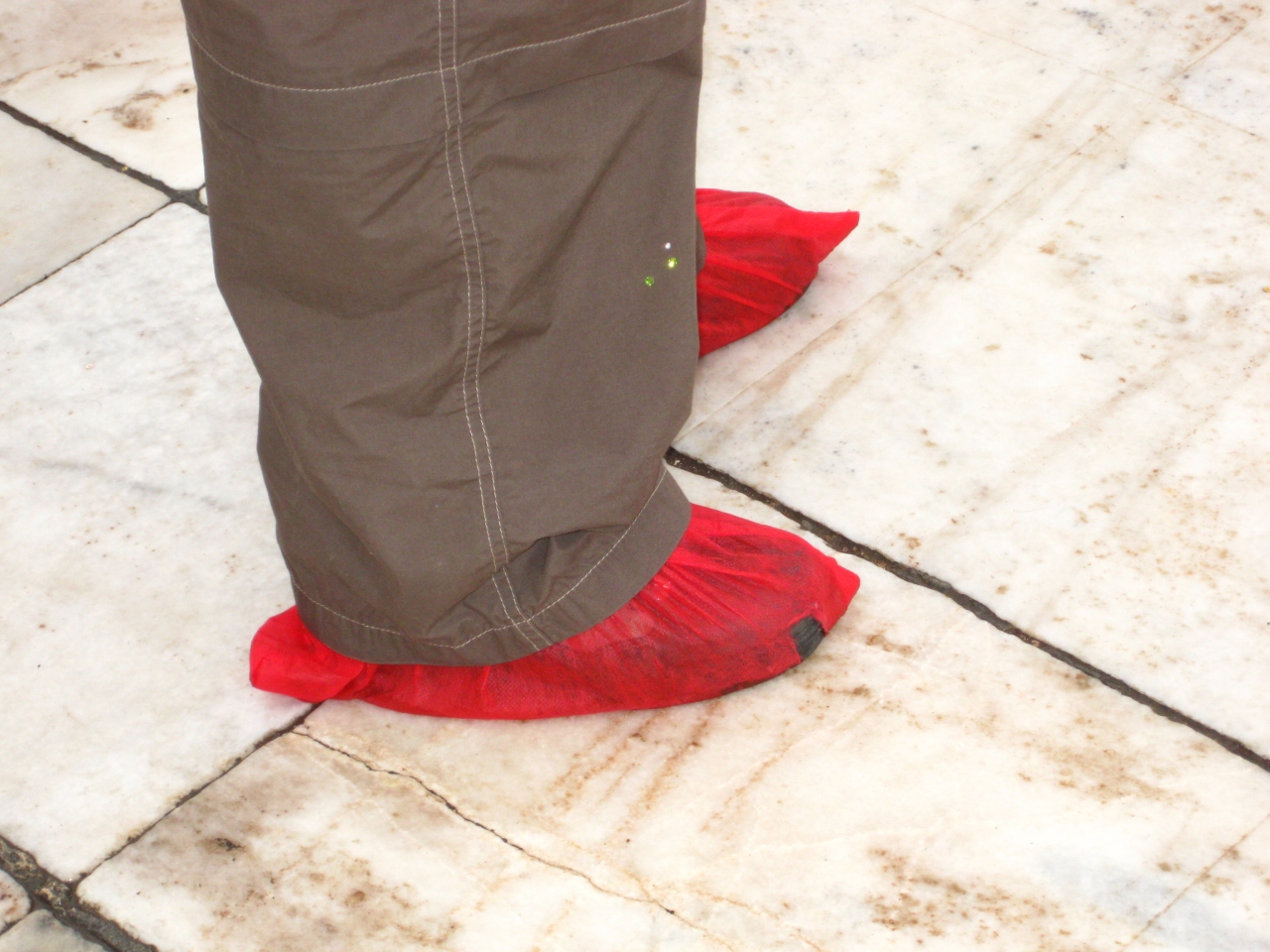 建物の壮大さは、ヨーロッパの有名な大聖堂以上のものを感じます。やっぱりインド旅行では外せないところです。大理石の「白さ」を大事にしているので、食べ物は持ち込み禁止です。この為、入場前に荷物のチェックがあります。履いてきた靴もここで脱いで裸足になるか、無料のビニールの靴下を貰って、履いていきます。外国人にはチップを要求されます。