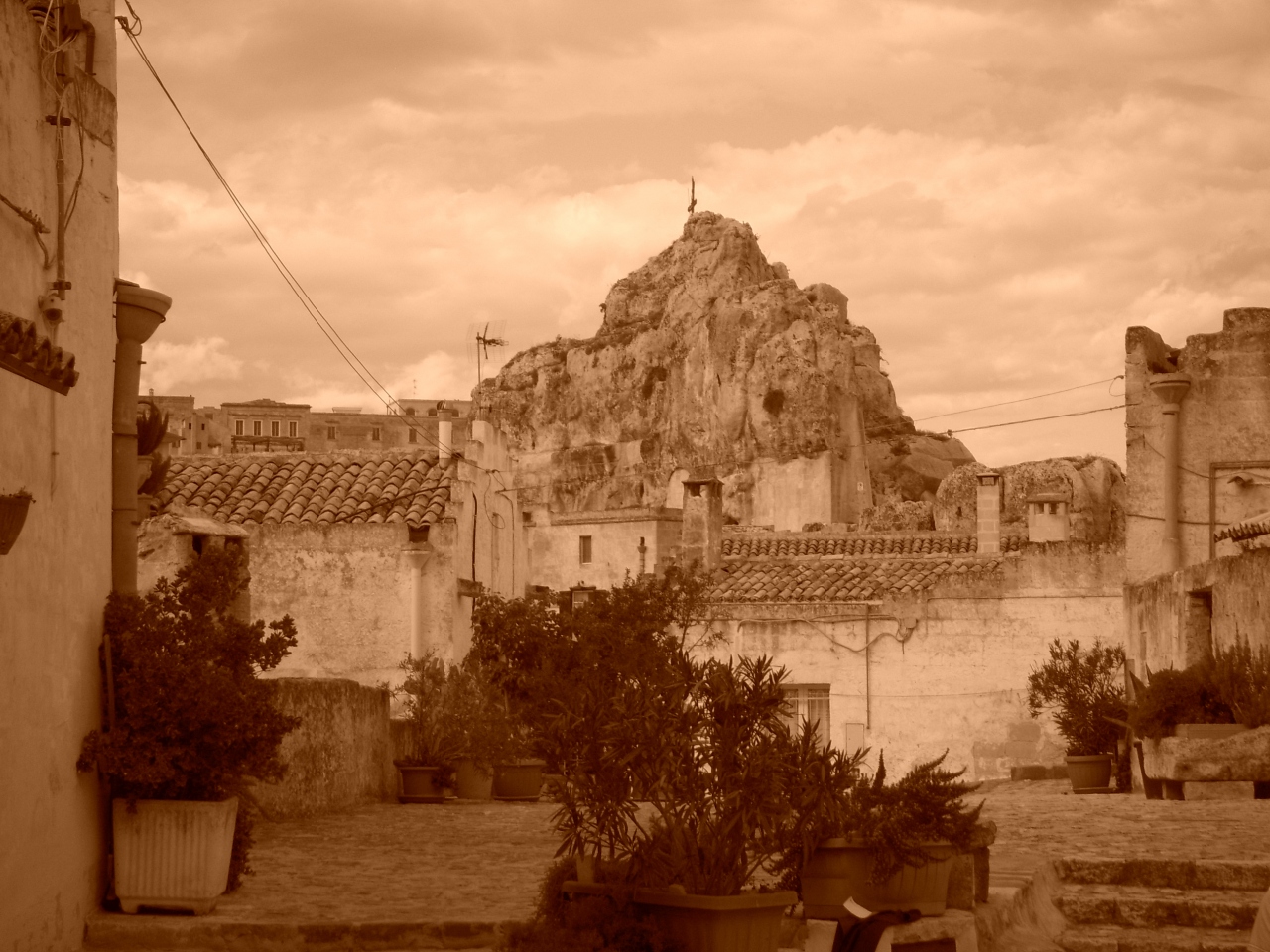 洞窟住居(Sassi)が連なるセピア色の町並みです。