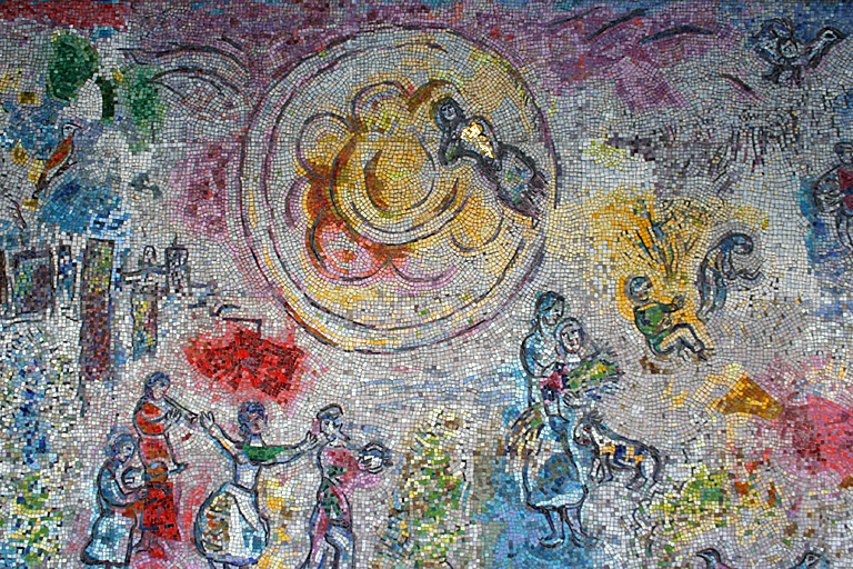 シャガールのモザイクを四面に施した壁が街中に唐突にあります。チェイスタワーの南側ですね。幅が21.34メートル、高さが4.3メートルと大きいので、じっくり楽しめます。