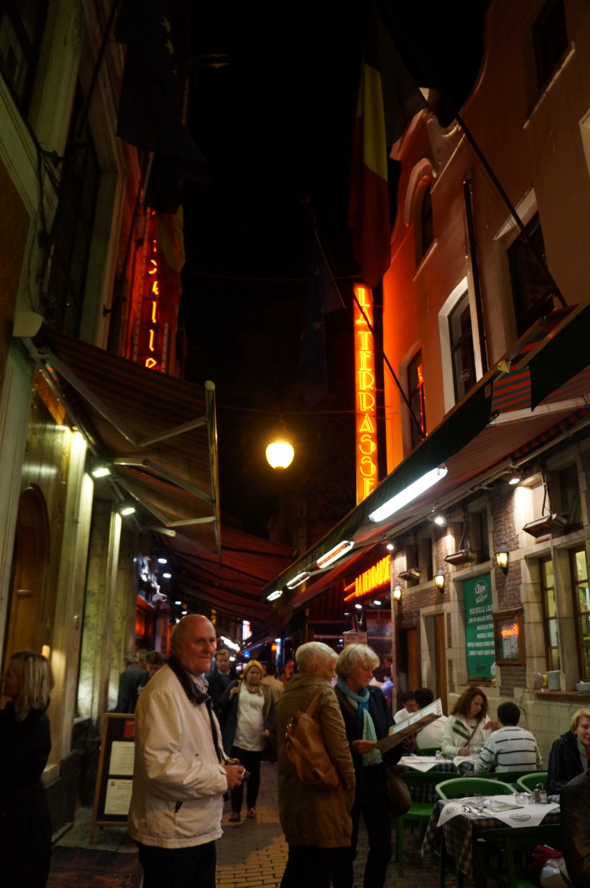 観光客がとても多いレストラン街。ブリュッセルは意外に日本人観光客が多いので日本語メニューをおいているレストランが多い。少しなら日本語をしゃべる店員もいました。