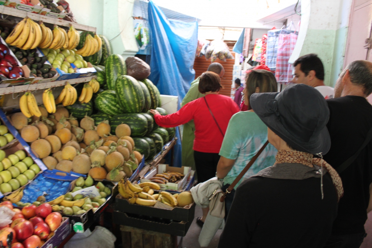 最初、港で降りてからバスで高台をひとまわりしたあと、グラン・ソッコ門からメディナの中に入った。早速、道端で野菜などを広げている場面に出会った。