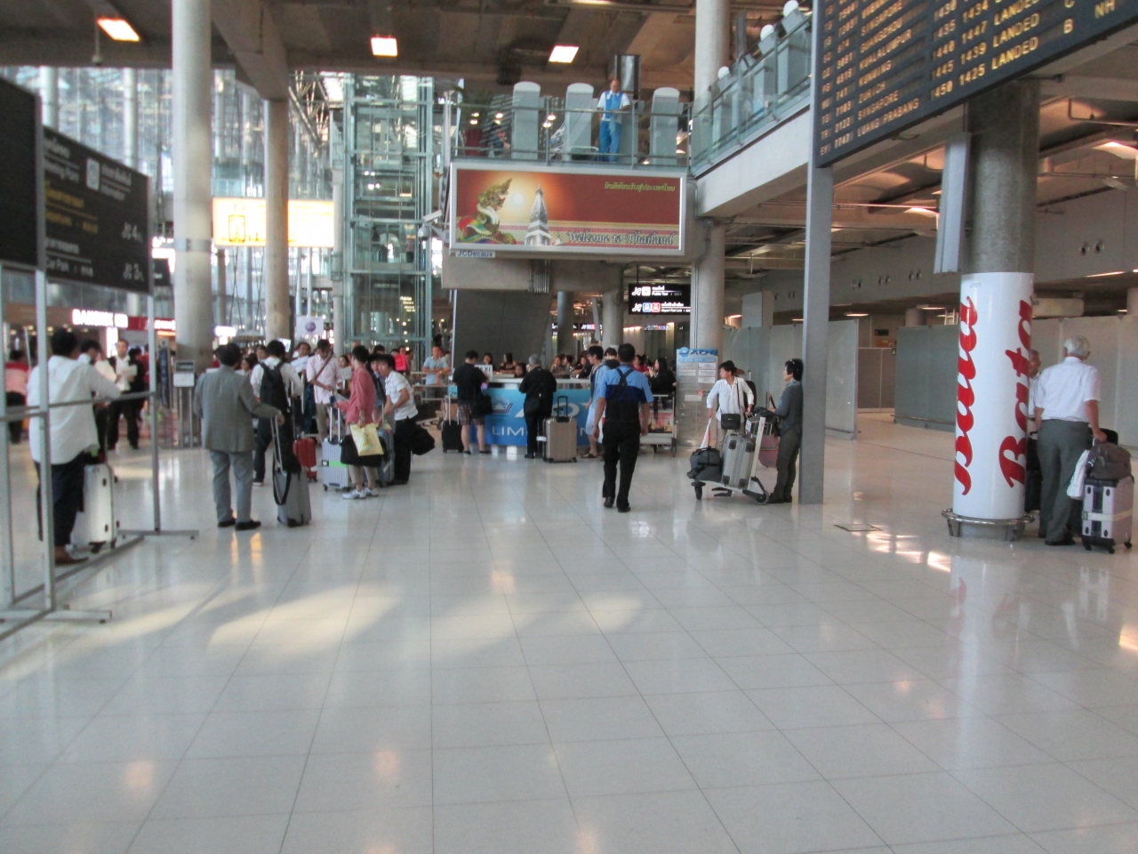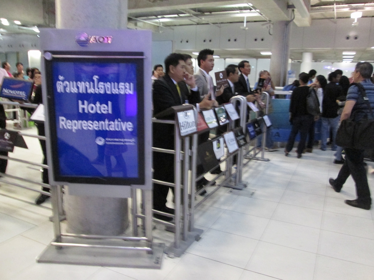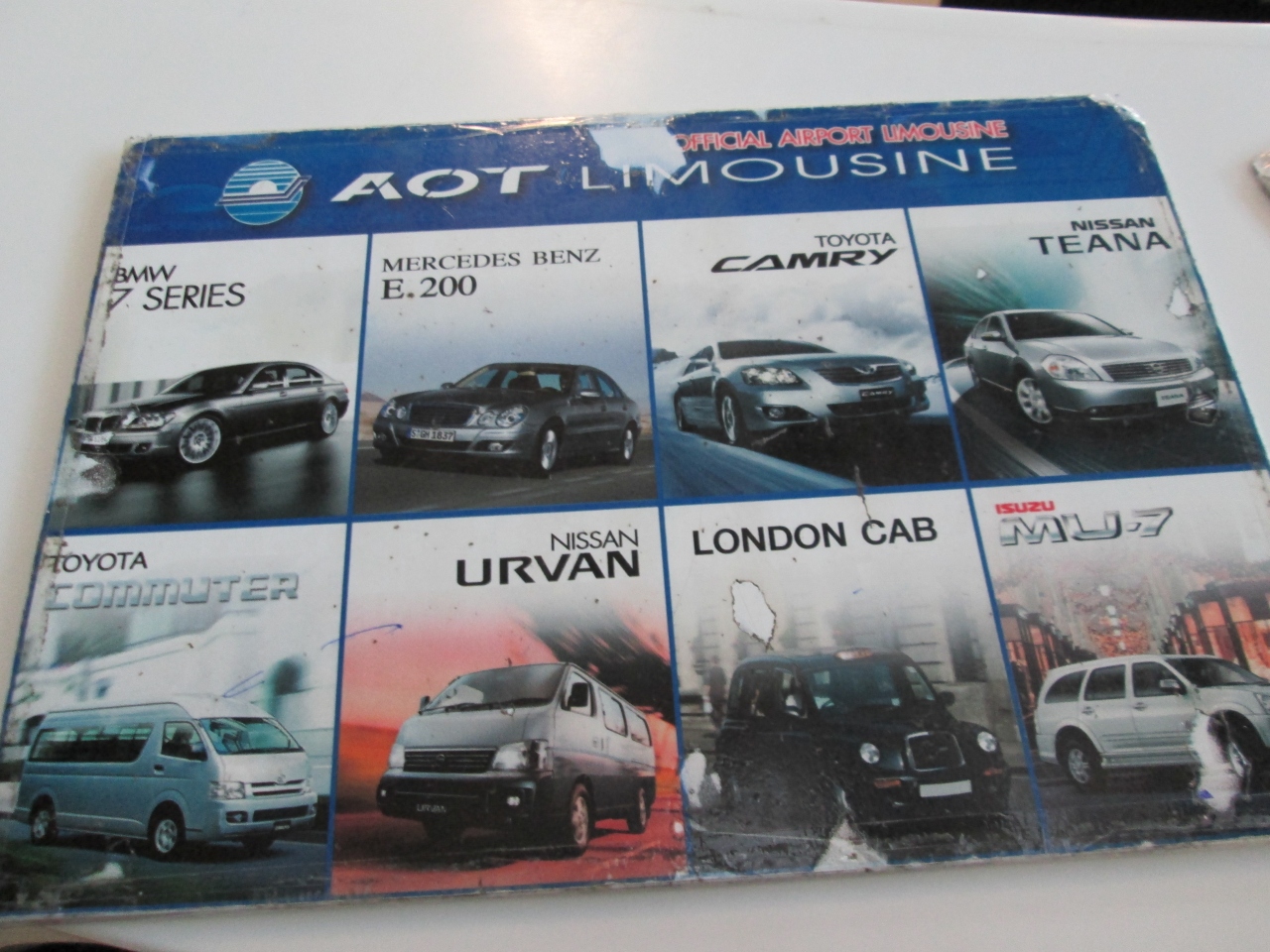 スワンナプーム空港から市内各ホテルへのリムジンです。空港到着階の税関申告のエリアを出るとすぐに受付があります。一番安いセダンで1100バーツで、チップは不要です。空港からホテルまでドアツードアで安全に移動できます。