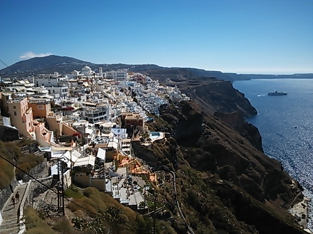 サントリーニというと、イアのイメージが強いですが、ここフィラからは岩壁にはりつく家並みをカメラにおさめるのがオススメです。白壁の家並みと岩壁、それに海がマッチしていて綺麗に写真を撮れます。オススメのポイントはケーブル乗り場近くから海方向に行き、岩壁の写真を撮る事。
