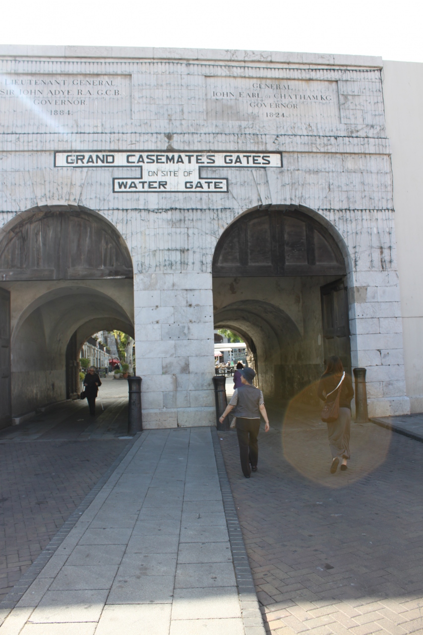 ジブラルタルへの出入国を管理するコントロールタワーを通過すると、そこからこのケースメイツ門の前まで行く5番のバスが出ている。(所要5分くらい。料金は往復で1.9£)バスはロンドンなどでも走っているダブルデッカーと呼ばれている2階建ての赤いバス。バスを使わないで歩くと12〜3分位で門に着く。バスはこの門の前に着くのでそこをくぐるとインフォメーションなどがある広場になっている。