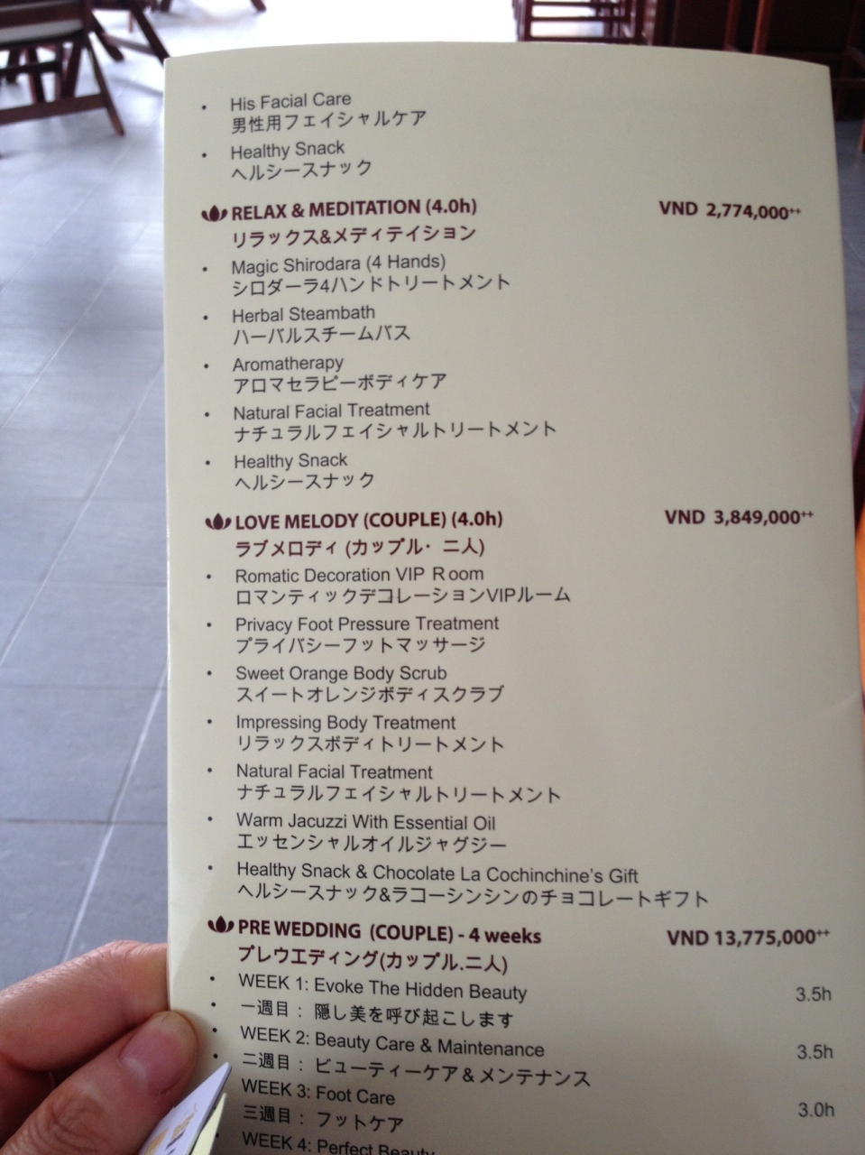 レックスホテル内にあるスパ。宿泊客は割引になりますが、午後5時までに入ればビジターでも割引料金になります。4時間のカップル向けコースがお得でした。マッサージ、フェイシャル、ジャグジー、フルーツ付き。ただジャグジーの温度はかなりぬるくてお湯を足しても長くはいられませんでした。実際の施術時間は3時間弱ぐらいだと思います。
