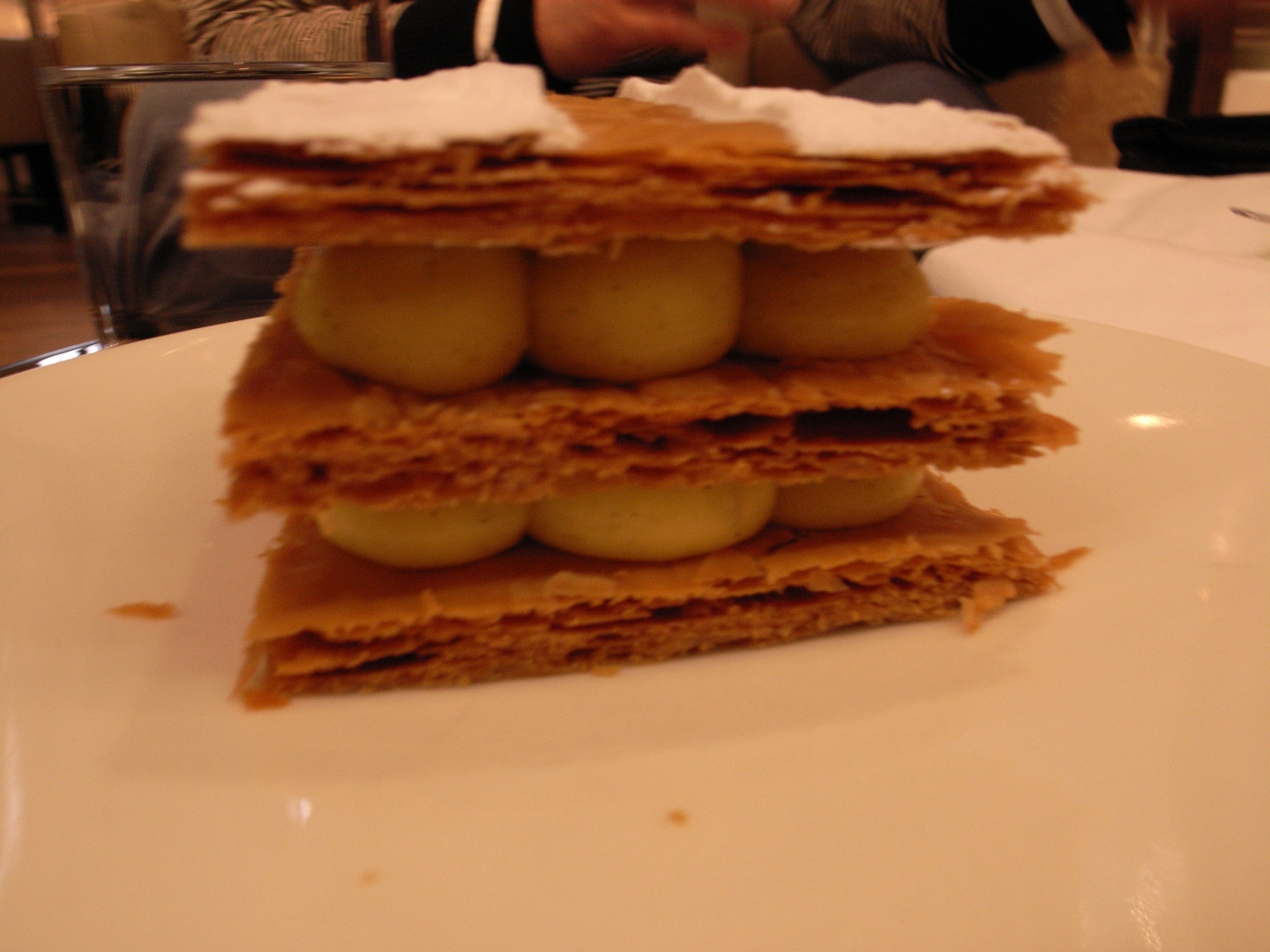 サダハルアオキさんもミルフィーユをお勧めしておりマレの散歩途中で寄りました。まだそれ程、知られていないのか店内はゆったりとしておりました。私たちが訪れた際は、パリジャンと日本人カップルがいました。お勧め通りレモンタルトとミルフィーユ、フルーツジュース、珈琲を頼みました。レモンタルトは品の良いレモンの香りがとても印象的でした。ミルフィーユは、パイ生地の食感がサクサクしており品よくまとめられていました。店内も広々としておりゆっくりと過ごせ快適でした。