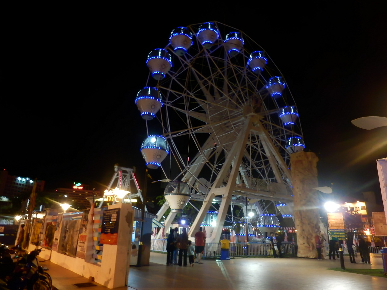 マラッカ川沿いの遊歩道を散歩していたら、観覧車が見えてきたので近付いてみたら、こちらの小さな遊園地でした。昼間に訪れたら門が閉まっていて、営業時間は夕方から深夜までと書かれていました。夜に再度訪れたら、観覧車やバイキングの船がライトアップされていて綺麗でした。入口には入園料についての記載がありましたが、チケット売り場も受付らしきものも見当たらず、そのまま中に入れました。平日の夜はお客さんは数人のみで、乗り物に乗っている人もおらず、閑散としていました。