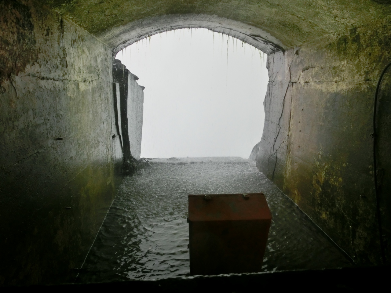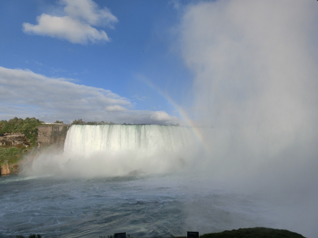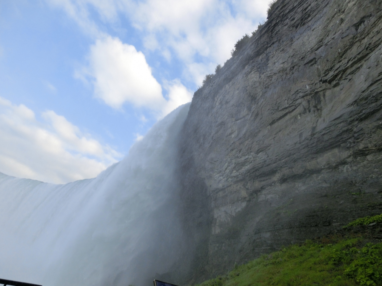 ナイアガラの滝を正面から楽しむのが霧の乙女号だとすれば、こちらは滝の横と裏から楽しめます。乙女号と同じくレインコートが配られて、いかにも古そうなエレベーターで滝の下まで下がっていきます。すると洞窟が現れ、奥に進んでいくと、滝が目の前に!