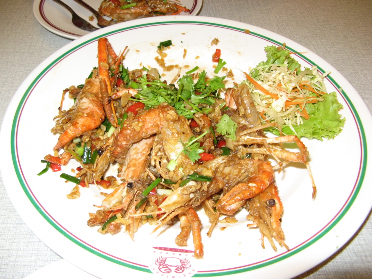 頼んだお料理は夫婦2人でブーバッポンカリー(殻なし)Sサイズ 220B、川海老のガーリック蒸し Sサイズ 325Bとビール1本です。