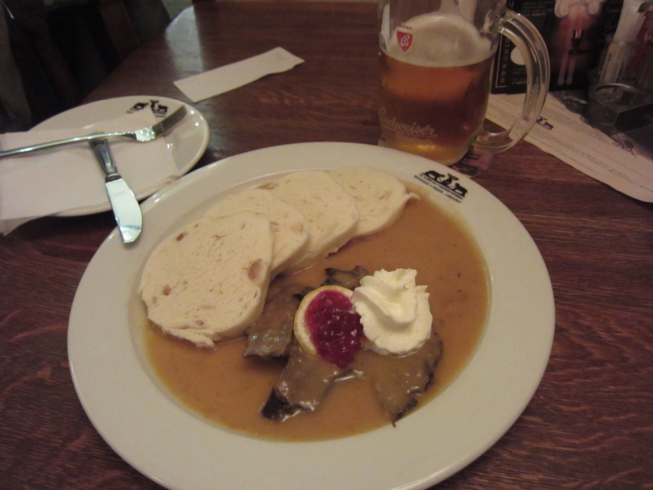 ローストポークのクネドリーキ添えを食べましたが、ソースとクネドリーキがとても美味しかったです。ビール1杯と料理1品で1000円くらいでした。チップはついていないと会計のときに言われましたが、少ししか付けなくても笑顔でいいよと言ってくれました。