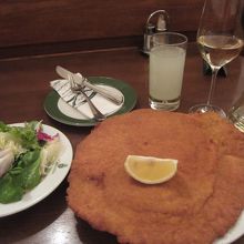 名物の巨大シュニッツェルは薄くて美味しかったです。持ち帰りができるので、必死に食べる必要がなくてよかったです。ミックスサラダの野菜が美味しく、いろんな野菜が入っていて、少しすっぱいドレッシングもとても美味しかったです。口コミで調べていったワインはあまり美味しくなかったんですが、ミネラルウォーターより安かった生レモン絞りのソーダが美味しかったです。揚げ物に合ってよかったですが、すっぱいものが苦手な人は無理かもってくらいすっぱいです。