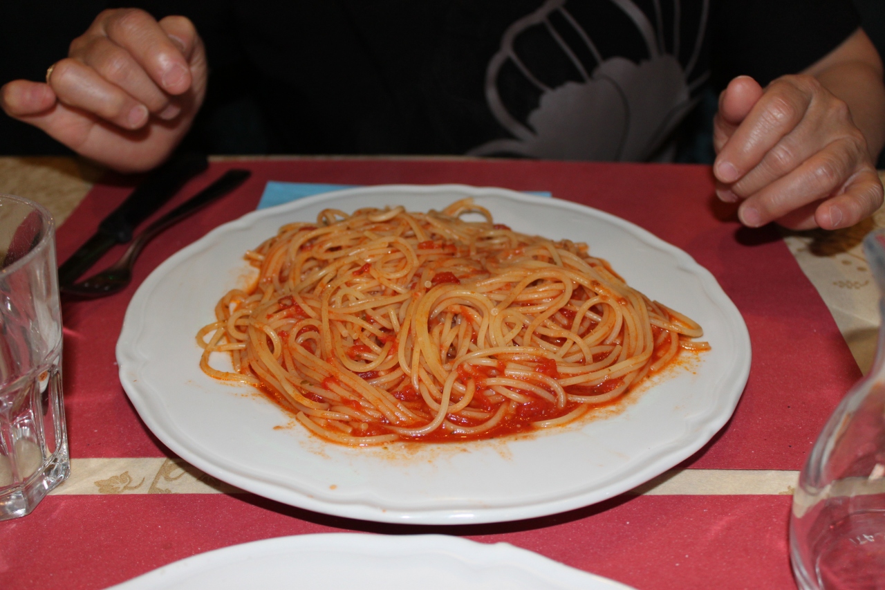 スパゲティはトマト味のシンプルなものだが、美味しく食べた。夫のラザニアはクリーム煮風。ワインや水も頼んで20ユーロ。トイレもきれい、値段も二重丸。