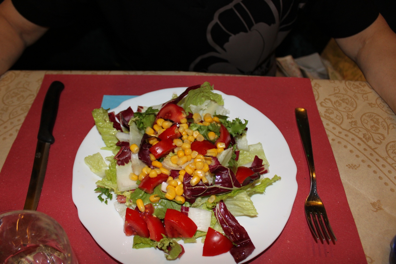私はランチコースのトマトスパゲティとサラダ。夫は単品でラザニアとソーセージの盛り合わせを注文。