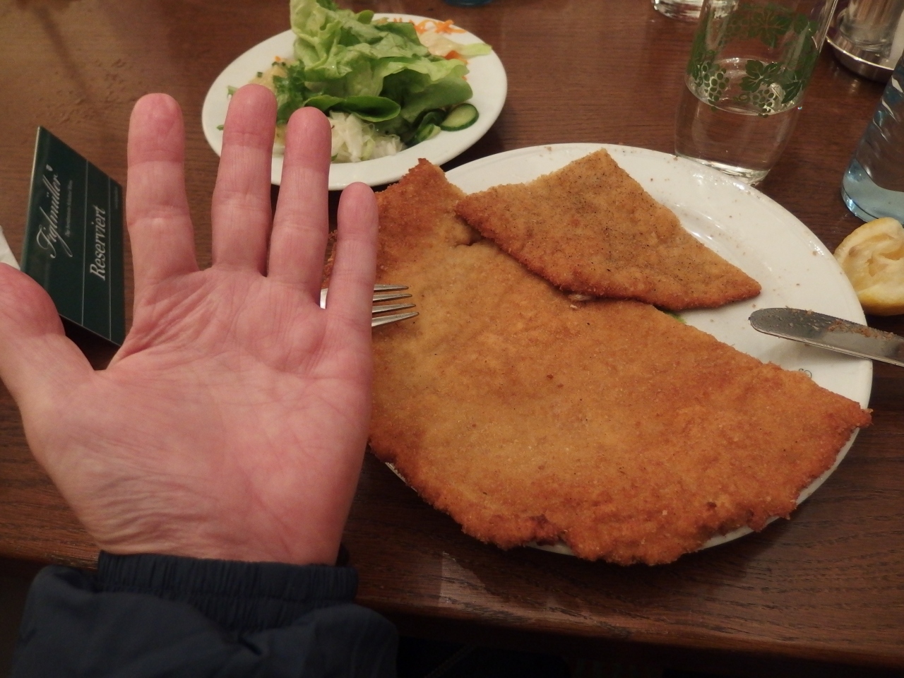 ドイツではあまり注文しないのですが、ウィーンが本場であるし、特大であるのし、地元の人にも人気が有るとのことで 行きました。本当に大きくて食べ切れませんでした。よく観察していると小サイズを注文している人も居ました。しかし隣のお婆ちゃん方も特大